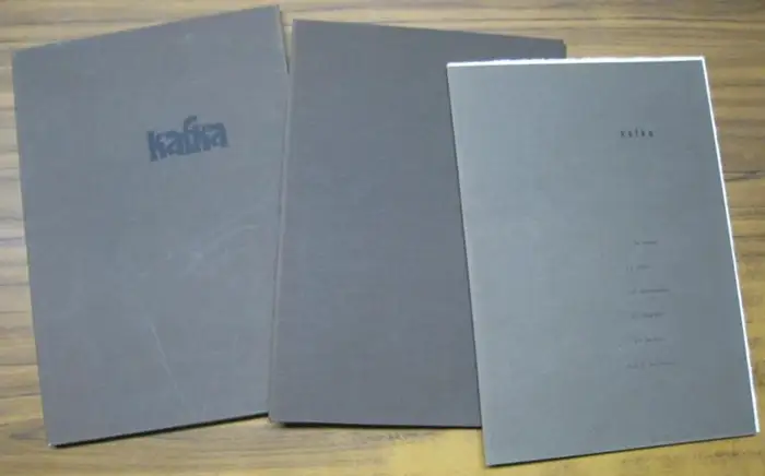 Freie Beschreibung: 39 x 27 cm. Originale dunkelbraune Leinenmappe ohne Einbandtitel, im gleichfarbigen dazugehörigen Leinenschuber, dieser trägt vorn den schwarz gedruckten Namen ' Kafka ' und ist nur leicht berieben ( siehe Foto ), untere vordere Ecke am Bezug mit winziger Fehlstelle. In der Mappe, wiederum geschützt von einem Papierumschlag mit Bildverzeichnis, liegen die 12 Blätter mit den Ätzradierungen ( Bildgröße 24 x 12 ), jedes am unteren Bildrand von Hand der Künstlerin in Bleistift numeriert und voll signiert. Durchgehend sauber und frisch. Guter Zustand. --- Original dark brown linen folder without a cover title, in the matching linen slipcase of the same color, this bears the name 'Kafka' printed in black on the front and is only slightly rubbed, the lower front corner of the cover with a tiny flaw. In the portfolio, again protected by a paper envelope with an image directory, are the 12 sheets with the etchings (image size 24 x 12), each numbered and fully signed by the artist in pencil at the lower edge of the image. Consistently clean and fresh. Good condition
