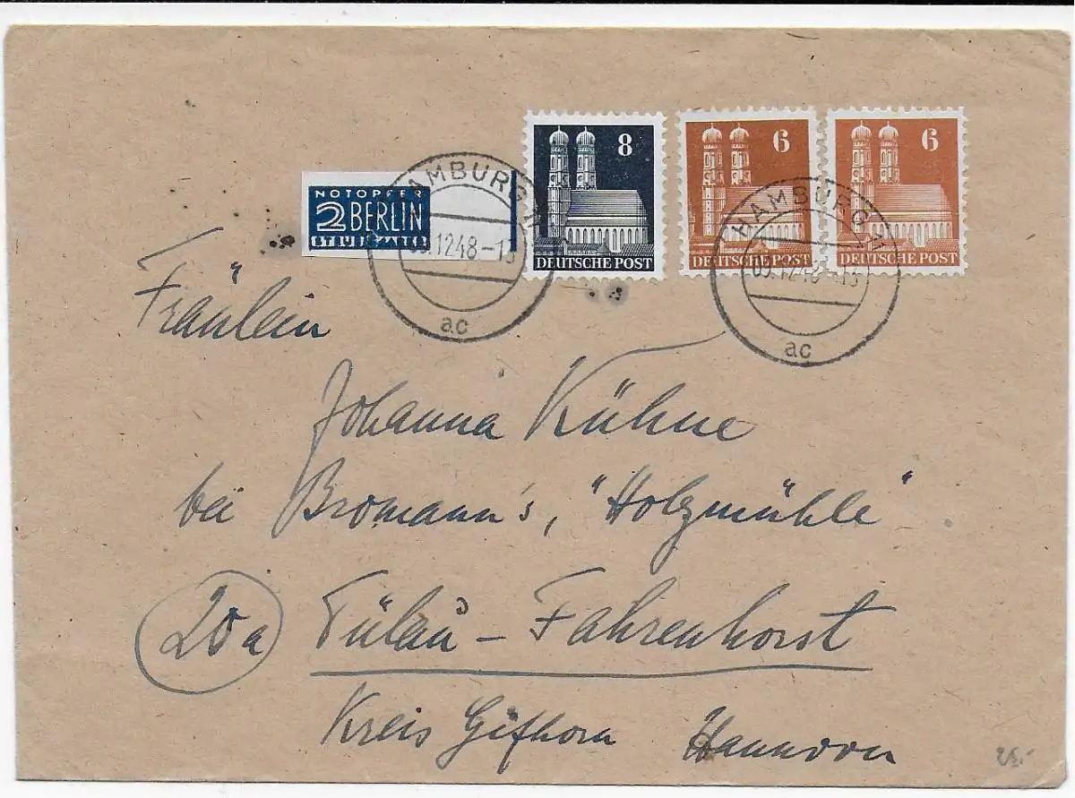 BiZone: Brief mit ungez. Notopfer von Hamburg