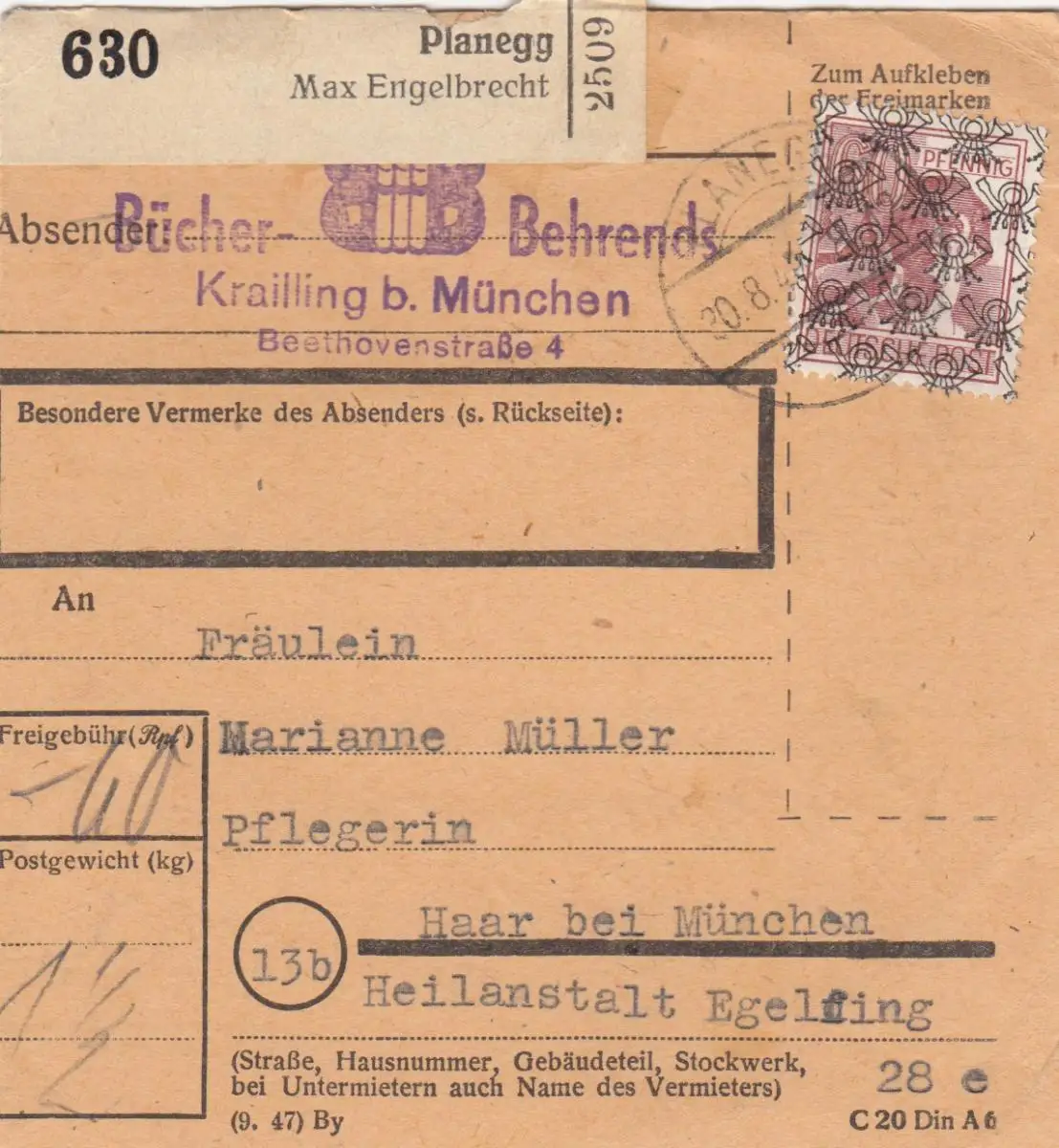 BiZone Paketkarte 1948: Planegg nach Haar, Selbstbucher, Heilanstalt Eglfing