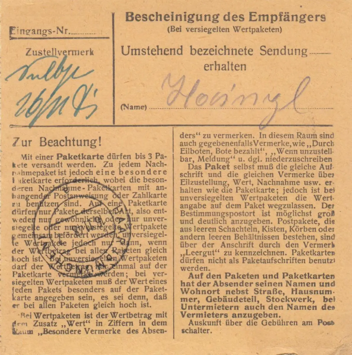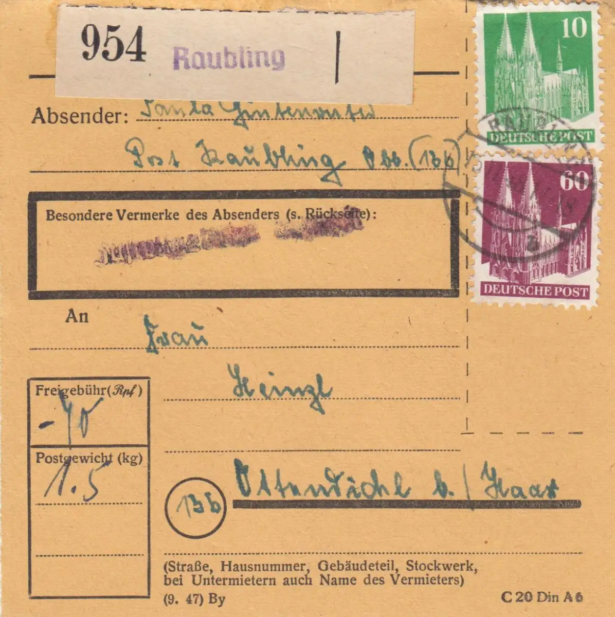 BiZone Paketkarte 1948: Raubling nach Ottendichl