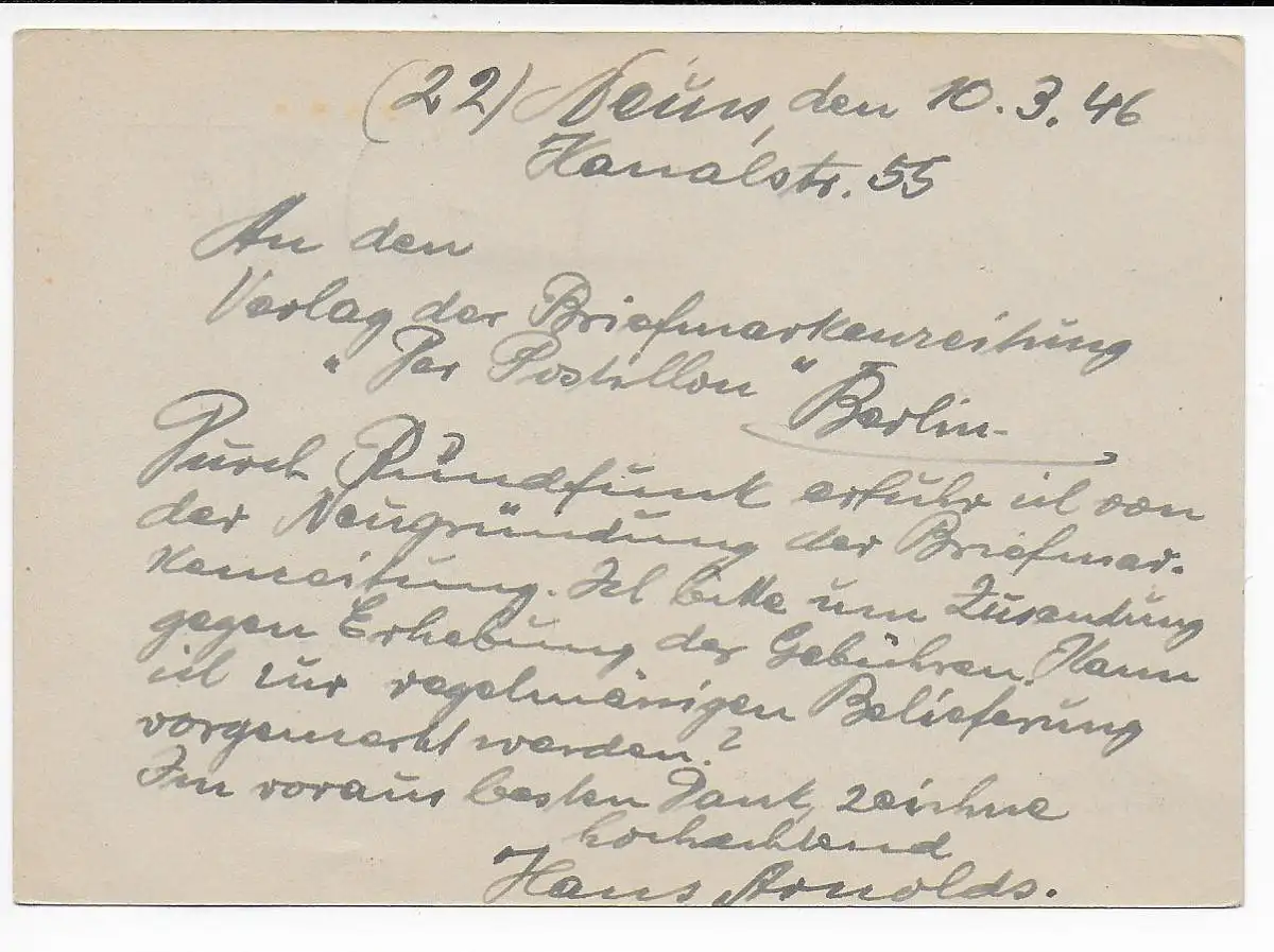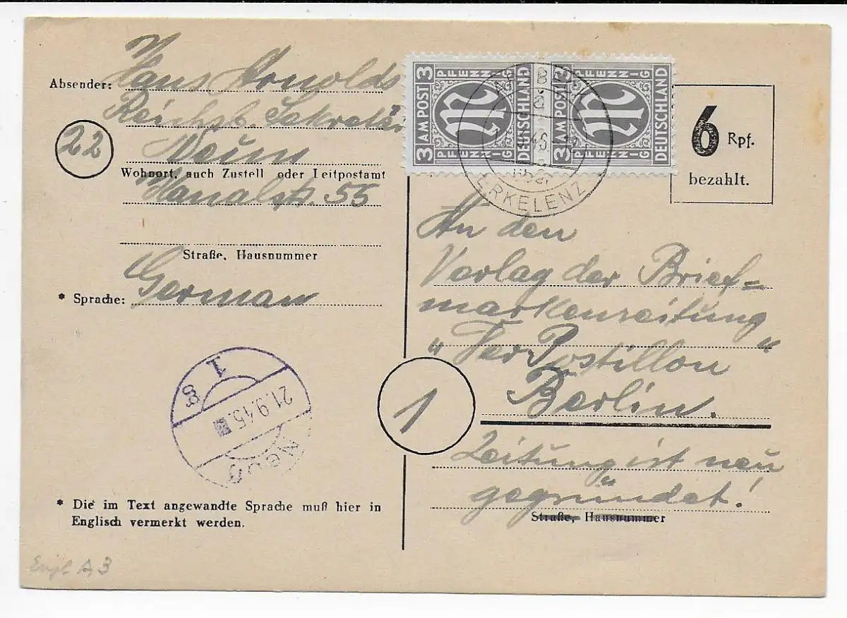 BiZone: Postkarte 1946 Arsbeck/Neuss nach Berlin, 1945/46