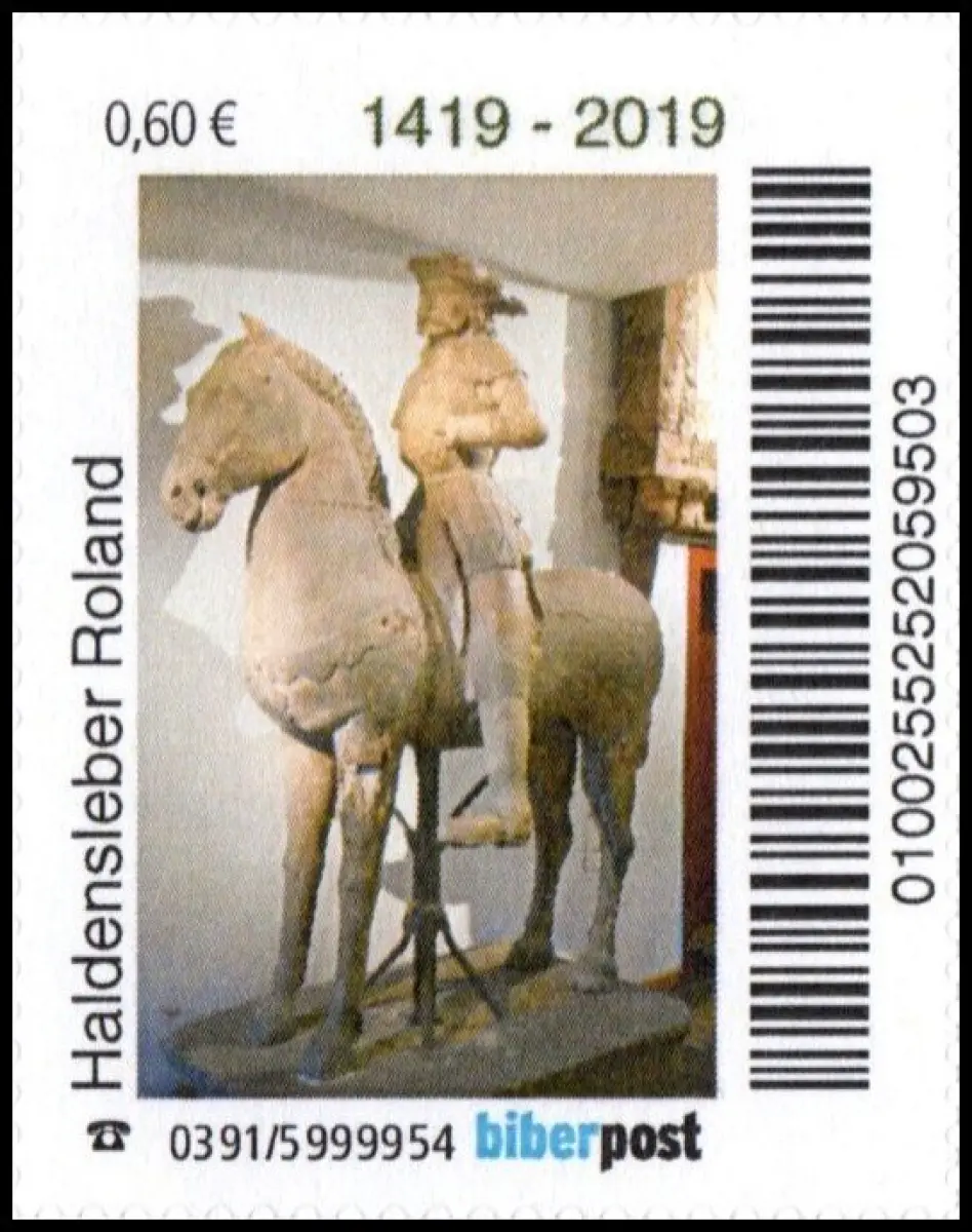 • MichSeite Biberpost: 04.05.2019, "Haldensleben: Roland, 1419 - 2019", Satz, postfrisch Beschreibung \nAusgabeland: Bundesrepublik Deutschland \nPostdienstleister: Biberpost, Magdeburg \nAusgabeanlass: personalisierte Briefmarkenausgabe "Haldensleben: Roland, 1419 - 2019" Katalognummer: - Ausgabedatum: 04.05.2019 Nominale: Satz (1 Wert) zu 0,60 EUR \nTyp: Typ VI (neues Logo) \nErhaltung: selbstklebend, zähnungsartig gestanzt, postfrisch \nHinweis: - Thema: Stadtrecht, Gericht, Richter, Statue, Schwert