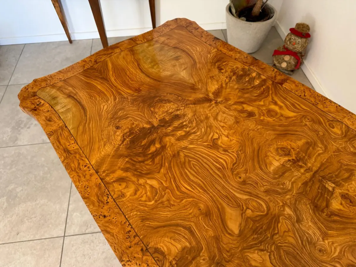 Die fein polierte Platte aus Nussholz Furniermaserung zeigt eine ausdrucksvolle Maserung mit symmetrischer Wurzelholzmaserung – ein charmantes Detail, das den hochwertigen Charakter dieses Stücks unterstreicht.