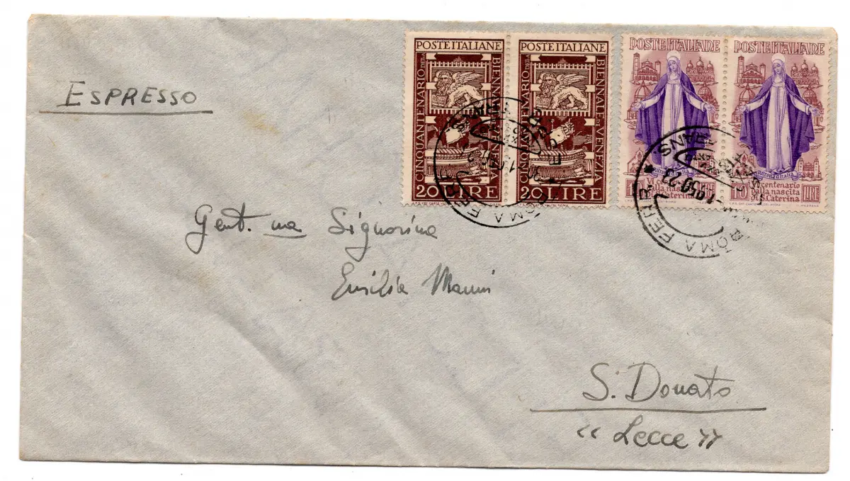 Umschlag - Biennale Lire 20 Nr. 596 zwei Exemplare (2. Auflage) + Ergänzungen Nr. 576 x 2 auf Exp. von Rom nach San Donato am 30.1.50 - im Tarif Cod. 295/17