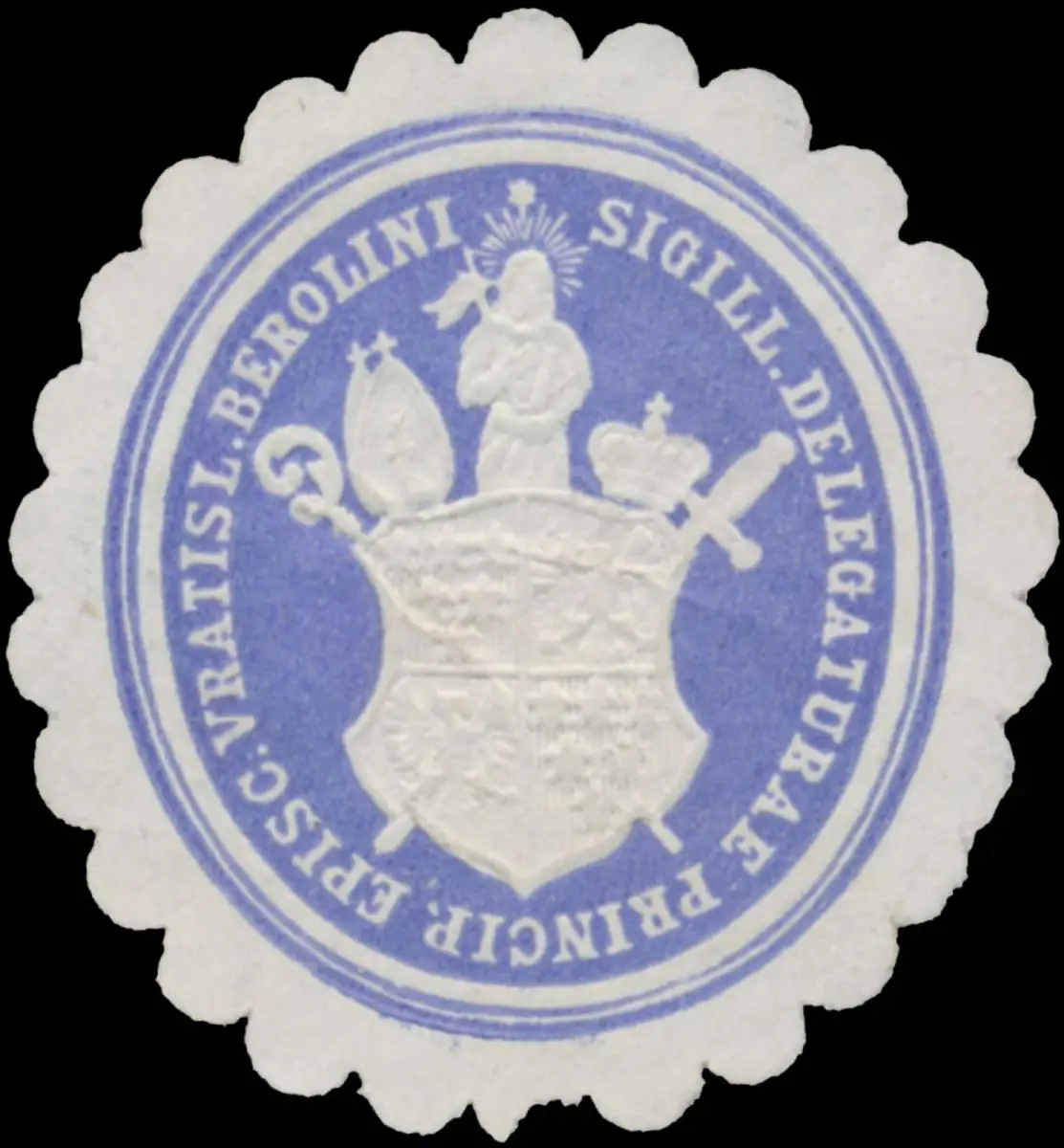 das Siegel der bischöflichen Hauptdelegation Vratislav Berolini, Kirche, Religion, Latein, Größe/Zustand: 4x3 , beschädigt, Original Verschluss-Siegelmarke aus Papier welche früher von Behörden, Firmen etc. zum Versiegeln der Briefe benutzt wurden