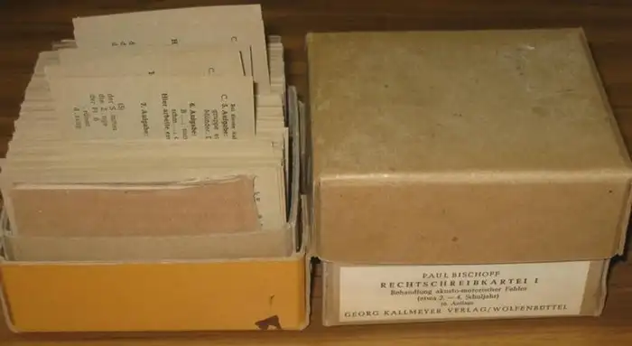 Bischoff, Paul: Rechtschreibkartei I. Behandlung akusto-motorischer Fehler (etwa 2. bis 4. Schuljahr). Beinhaltend 1) 16 Karten Ähnlich klingende Mitlaute und Mitlautverbindungen. 2) 14 Karteikarten Ähnlich klingende Selbstlaute. 3) 2 Kärtchen Umkehrung v