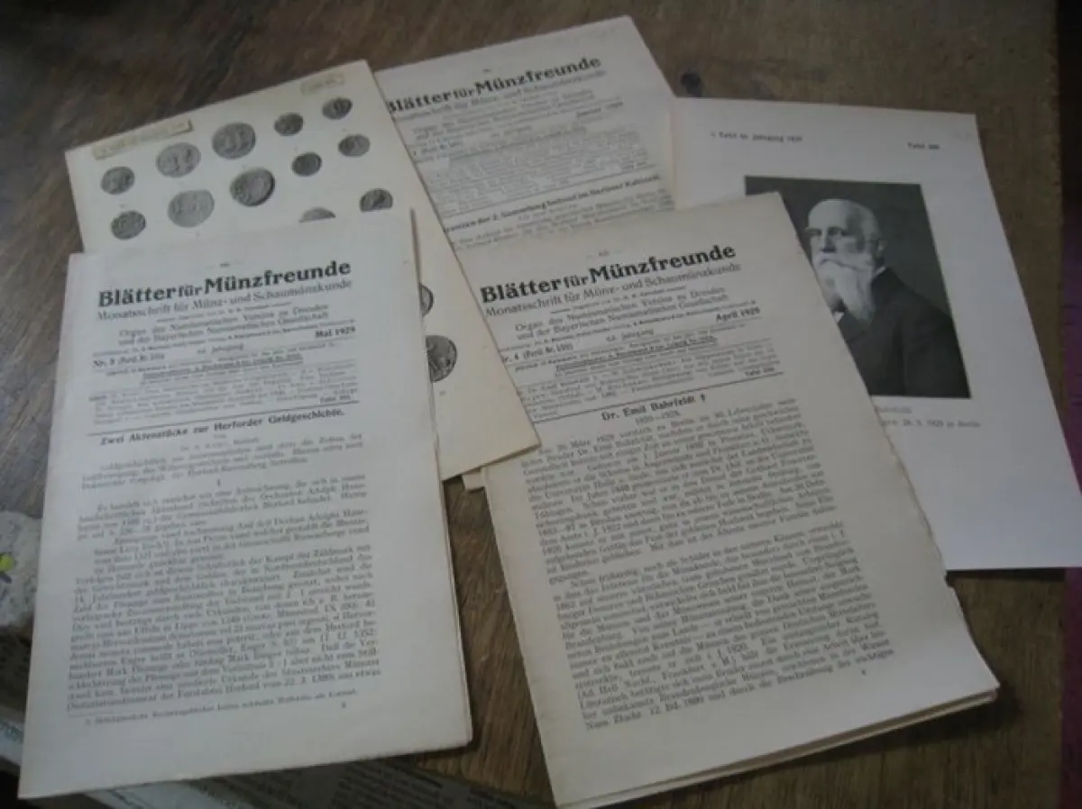 Blätter für Münzfreunde. - Dr. E. G. Gersdorf (Begr.). - Herausgeber: E. Mertens. - Beiträge: Kurt Regling, R. Kohl, Max von Bahrfeldt u. a: Blätter für Münzfreunde. 64. Jahrgang 1929, Konvolut mit den Heften 1, 4 und 5 (von 12), mit 2 Tafeln. - Aus dem I