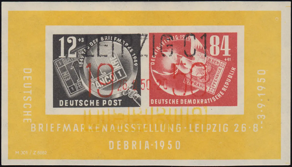 Block 7 DEBRIA - Drei-Farben-Stempel ET 26.8.50, Schneidemarkierung oben rechts