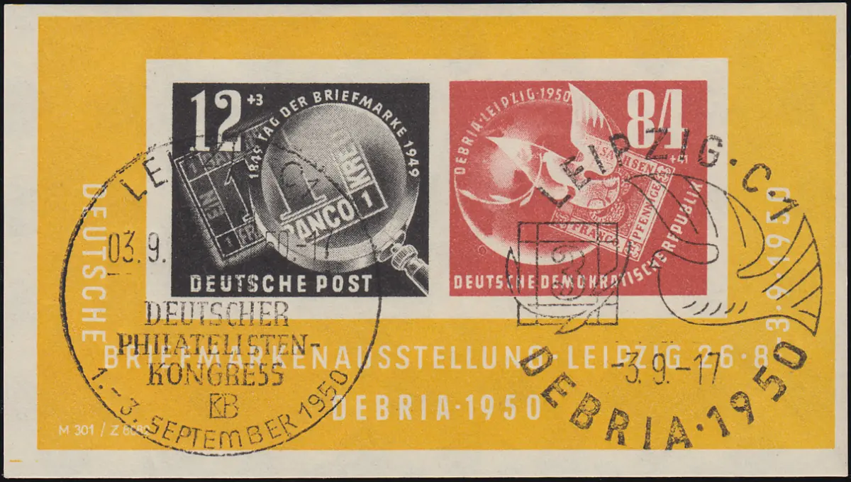 Block 7 DEBRIA - zwei SST Leipzig DEBRIA 3.9.50, Schneidemarkierung unten links