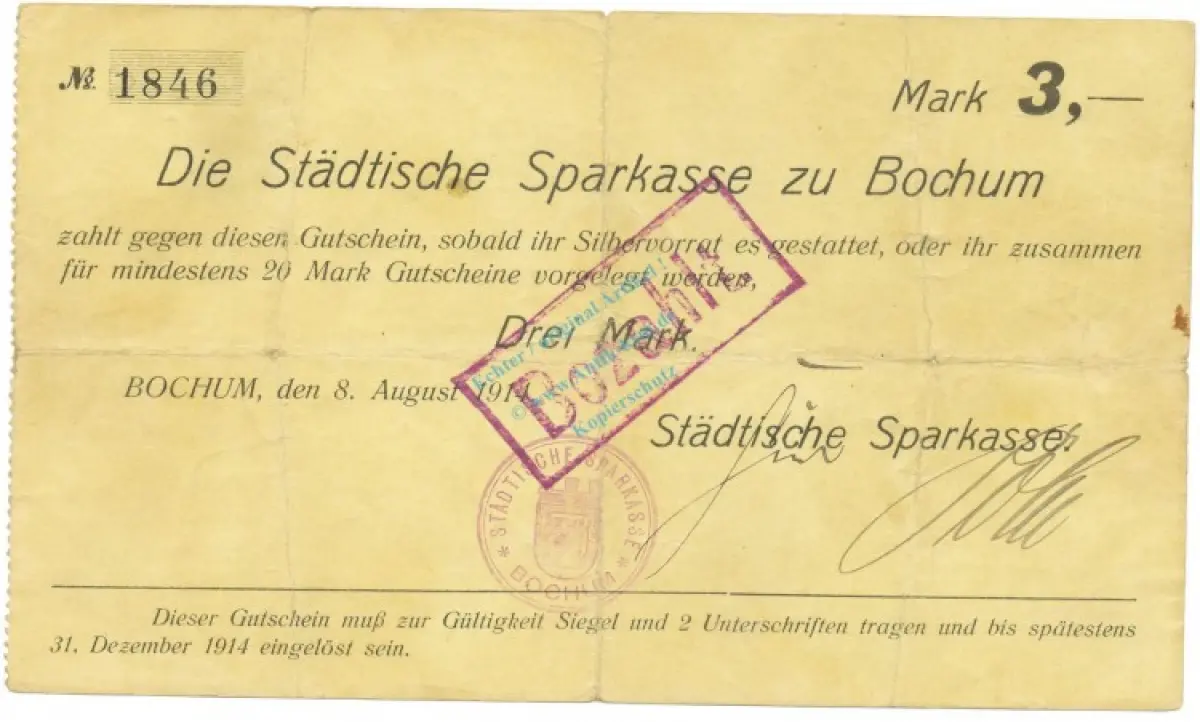 Bochum , Notgeld 3 Mark Schein gbr.E Diessner 36.3.a , Westfalen 1914 Notgeld 1914-15