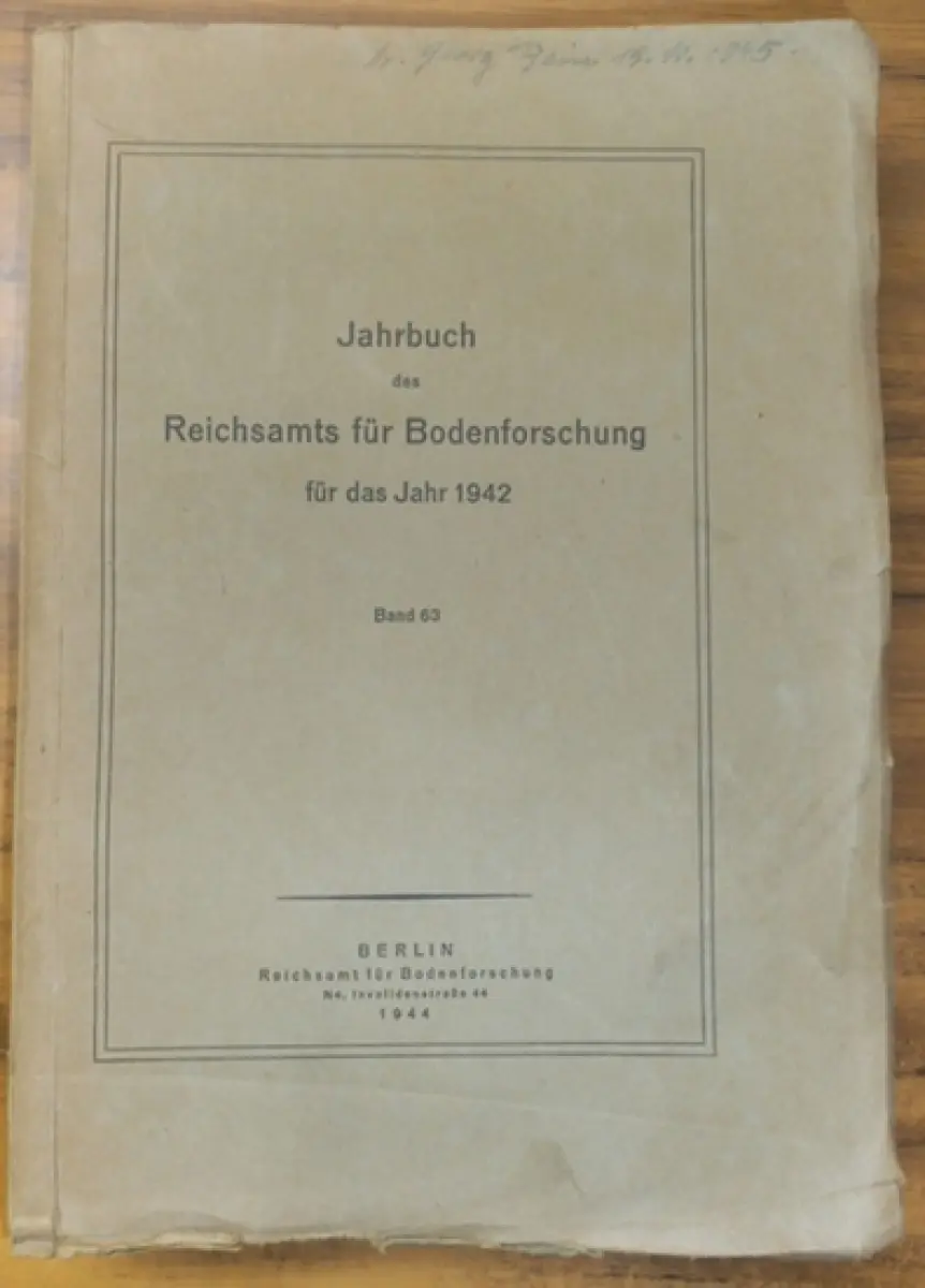 Titel: Jahrbuch der Reichsstelle ( des Reichsamts ) für Bodenforschung für das Jahr 1942. Band 63. Beiträge mit mehr als 50 S.: Otto Barsch: Aufgaben der angewandten Geophysik in Großdeutschland und im europäischen Raum. / Walter Hasemann: Geologie und Wasserversorgung in Banden und im Elsaß. / Otto H. Schindewolf: Über die Bedeutung der Paläontologie als geologische Grundwissenschaft. / Otto Seitz: Über Stratigraphie und Paläogeographie des Salzgitterer Eisenerzes im Gebiete von Hornburg / Grahmann, Karl Rudolf: Die Aufnahme der Grundwässer im Lande Sachsen / Herbert-Lothar Heck: Marines Pliozän in Schleswig-Holstein und der und der Bredtstedter Ton u.a