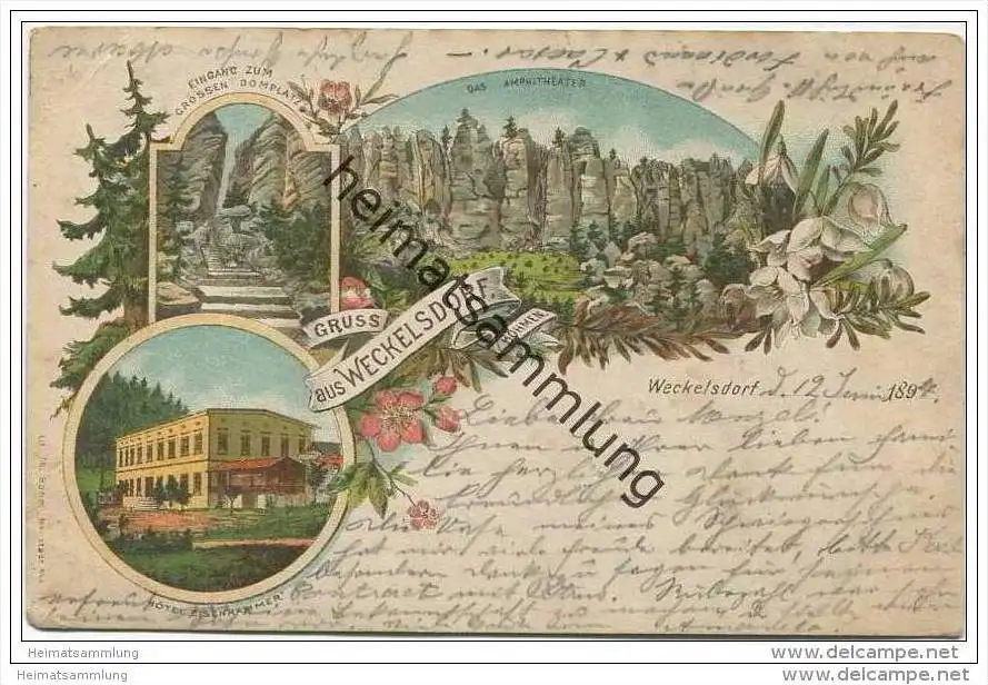 Gruss aus Weckelsdorf - Eingang zum grossen Domplatz - Hotel Eisenhammer - Amphitheater - Verlag Th. Böhm Neustadt a. M. (E9022) gel. 1894
