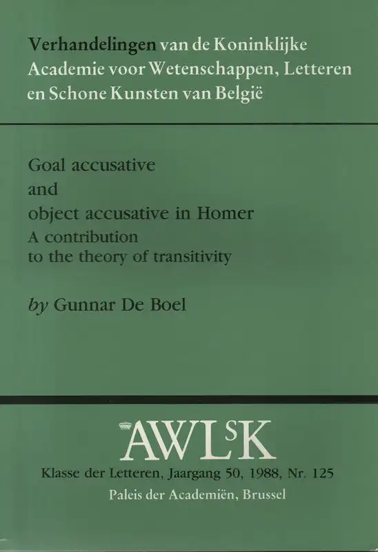 Boel, Gunnar de: Goal accusative and object accusative in Homer: a contribution to the theory of transitivity. (Verhandelingen van de Koninklijke Academie voor Wetenschappen, Letteren en Schone Kunsten van België, Klasse der Letteren ; 125).