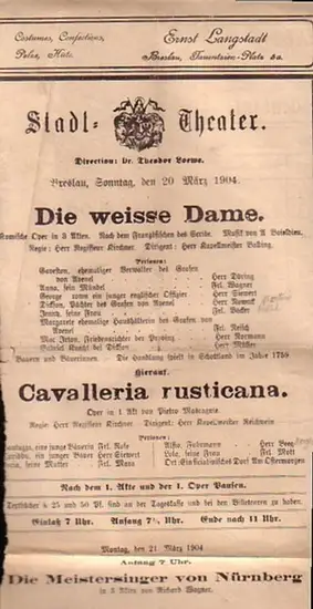 Titel: Programmzettel zu: Die weisse Dame. Komische Oper in 3 Akten. Nach dem Französischen von Scribe. Regie: Herr Kirchner. Dirigent: Herr Balling. / Mascagni: Cavalleria rusticana. Oper in 1 Akt. Regie: Herr Kirchner. Dirigent: Herr Reichwein. Aufführung am 20. März 1904 im Stadt - Theater, Breslau. Direction: Theodor Loewe. Aus der Breslauer Zeitung ?