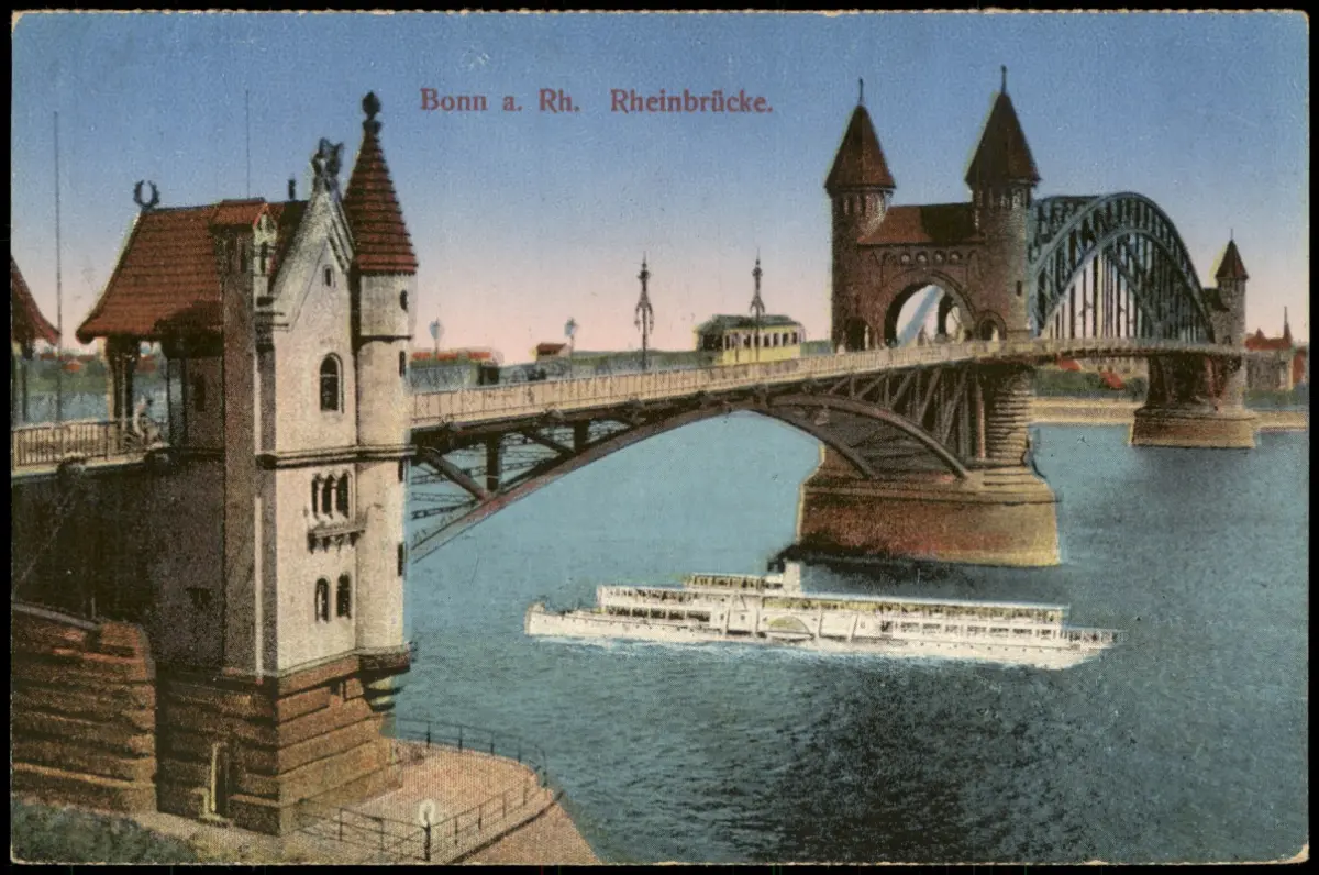 Bonn Tram Straßenbahn auf der Rheinbrücke, Rhein Dampfer Schiff 1924