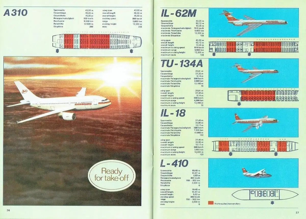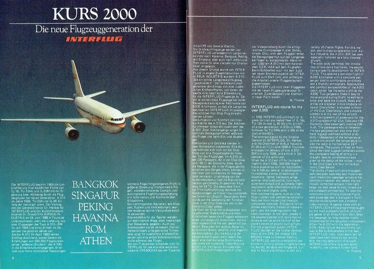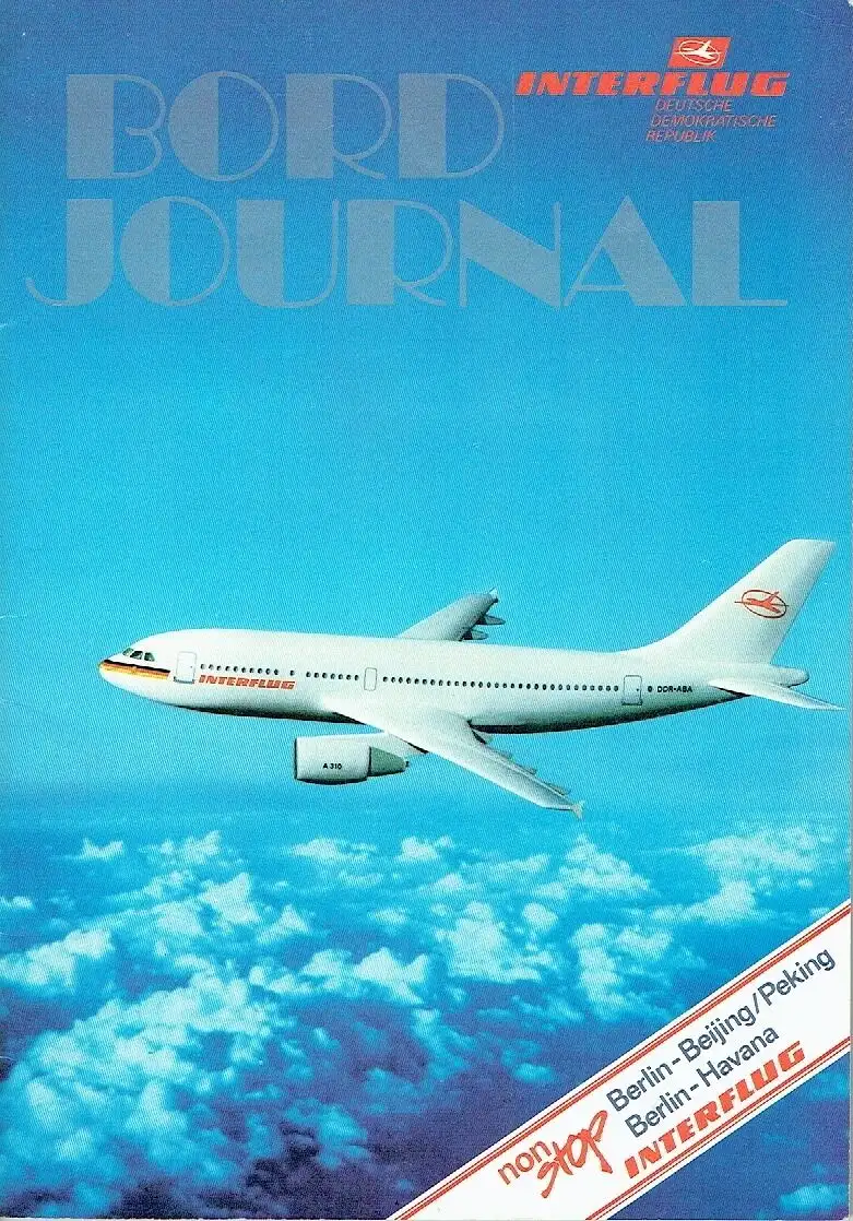 sehr guter Zustand, geringe Gebrauchs- und Alterungsspuren: Umschlag teils mit kleinen Randblessuren, Redaktionsschluss war Oktober 1988, erschienen dann wohl Anfang 1989 - INTERFLUG im 40. Jahr der DDR / INTERFLUG in the GDR's 40th year - Visitenkarte Flughafen Berlin-Schönefeld / Visiting card of Berlin-Schoenefeld Airport - INTER FLUG auf Kurs 2000 / INTERFLUG sets a course for the year 2000 - Schweres leichtgemacht / Where's the problem? - Kairo — seit Jahrhunderten ohne Konkurrenz / Cairo — unrivalled for centuries - Das Fliegertrainingszentrum der INTERFLUG / INTERFLUG's Flight Training Centre - Startklar für Ihre Messegeschäfte / All set for business at the trade fair - Liebe Fluggäste ... Dear Passengers ... - Flugzeugtypen / Typs of aircraft - Wir wissen, wie das Wetter wird / We know, what the weather's going to be like - Einkaufen an Bord / Shopping on board - Die Sauerstoff-Mehrschritt-Therapie / The Multi-phase Oxygen Treatment - Praxisorientiert: Fernerkundung der Erde / Practice-oriented: Remote sensing of the Earth - Streiflichter durch die Luftfahrtgeschichte / Glimpses into the history of aviation, kartoniert, ca. 20 x 28,5, 48 Seiten mit zahlreichen Bildern