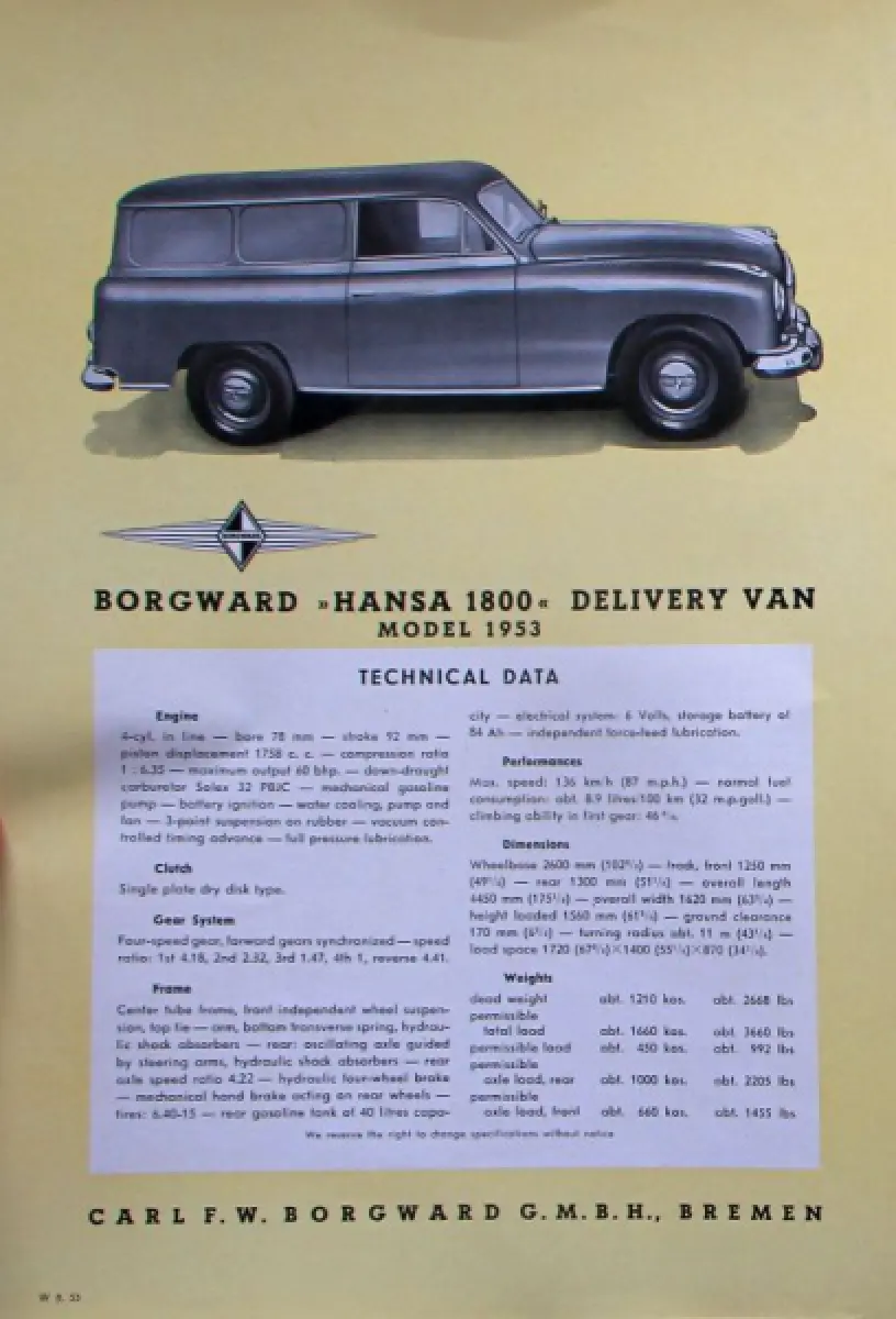 Borgwared Hansa 1800 Delivery Van Modellprogramm 1953 Automobilprospekt (10073)