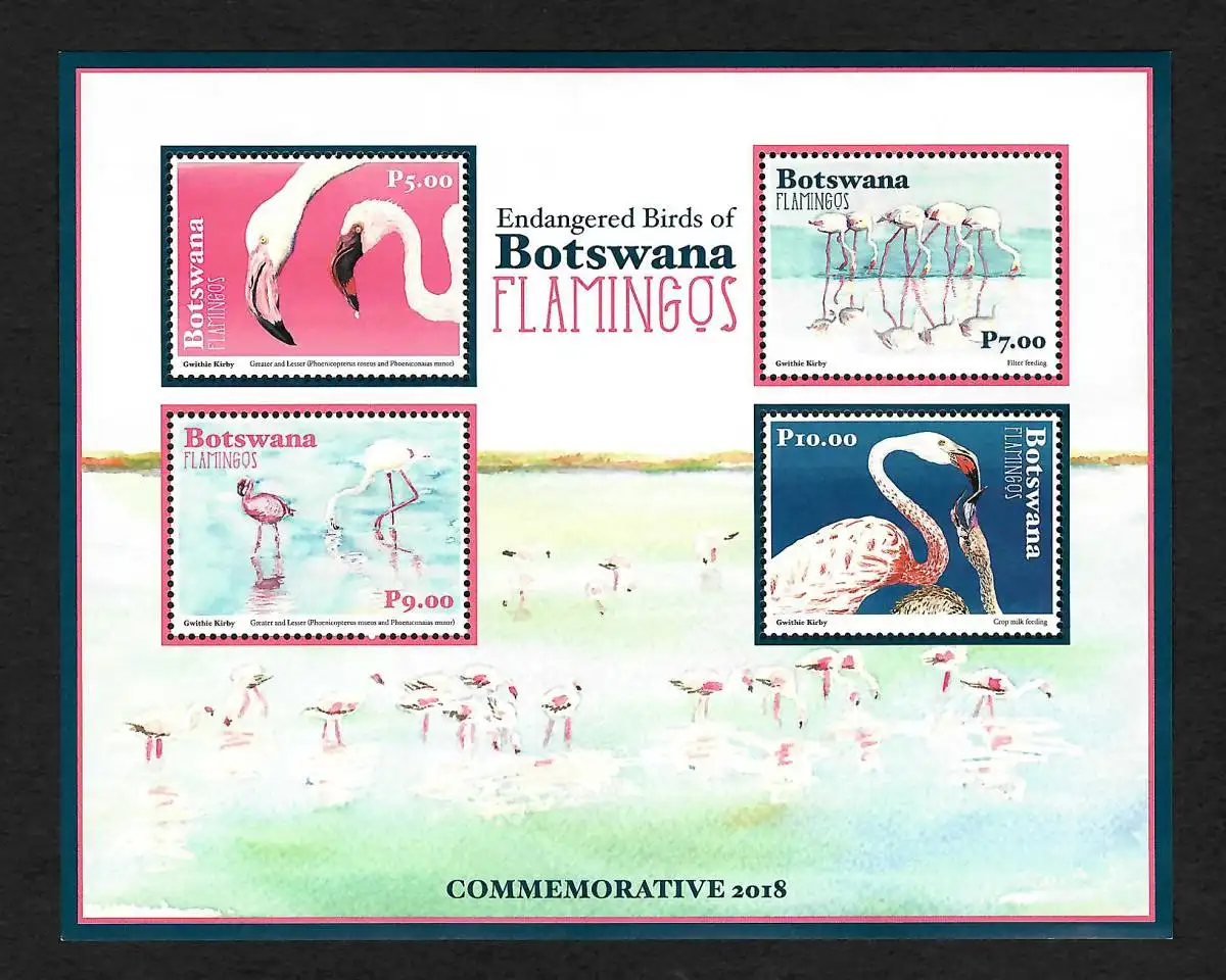 Botswana: Gefährdete Vögel, Flamingos, 4x Briefmarken im Block postfrisch