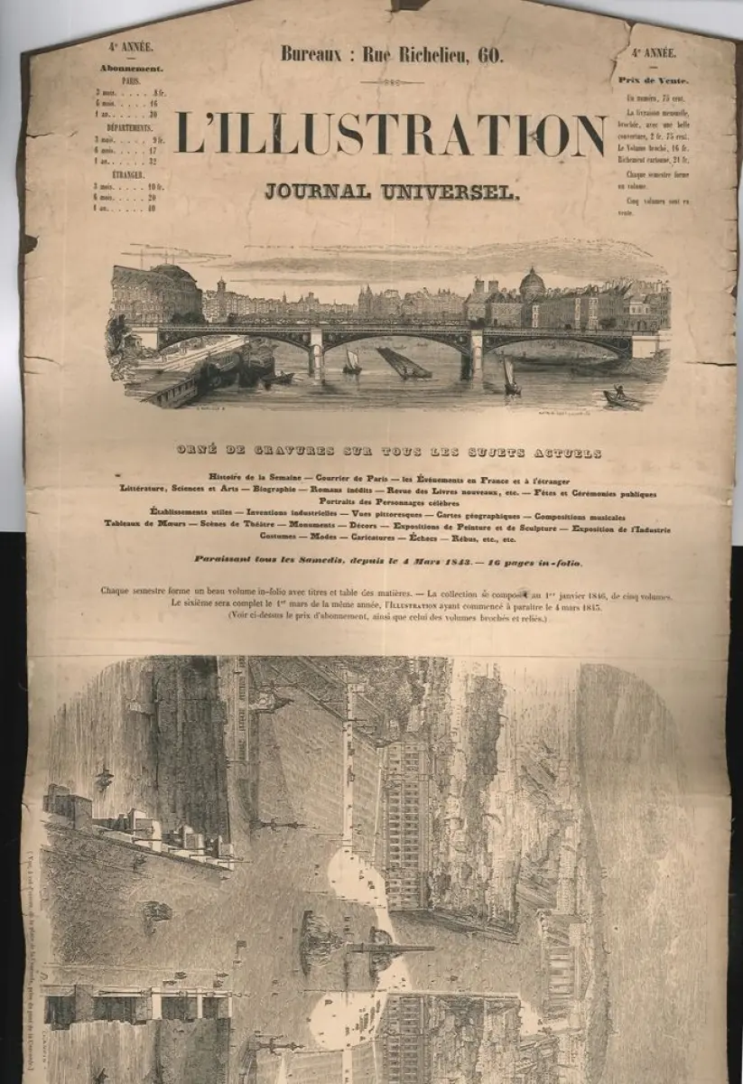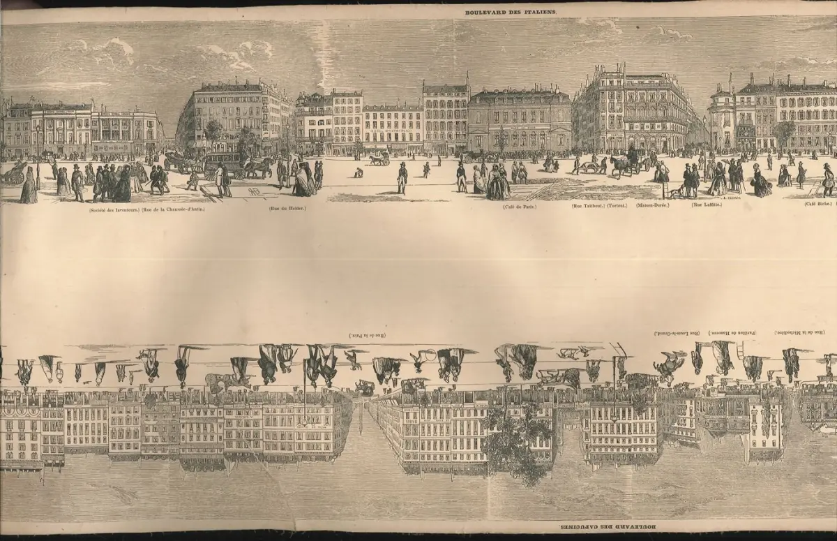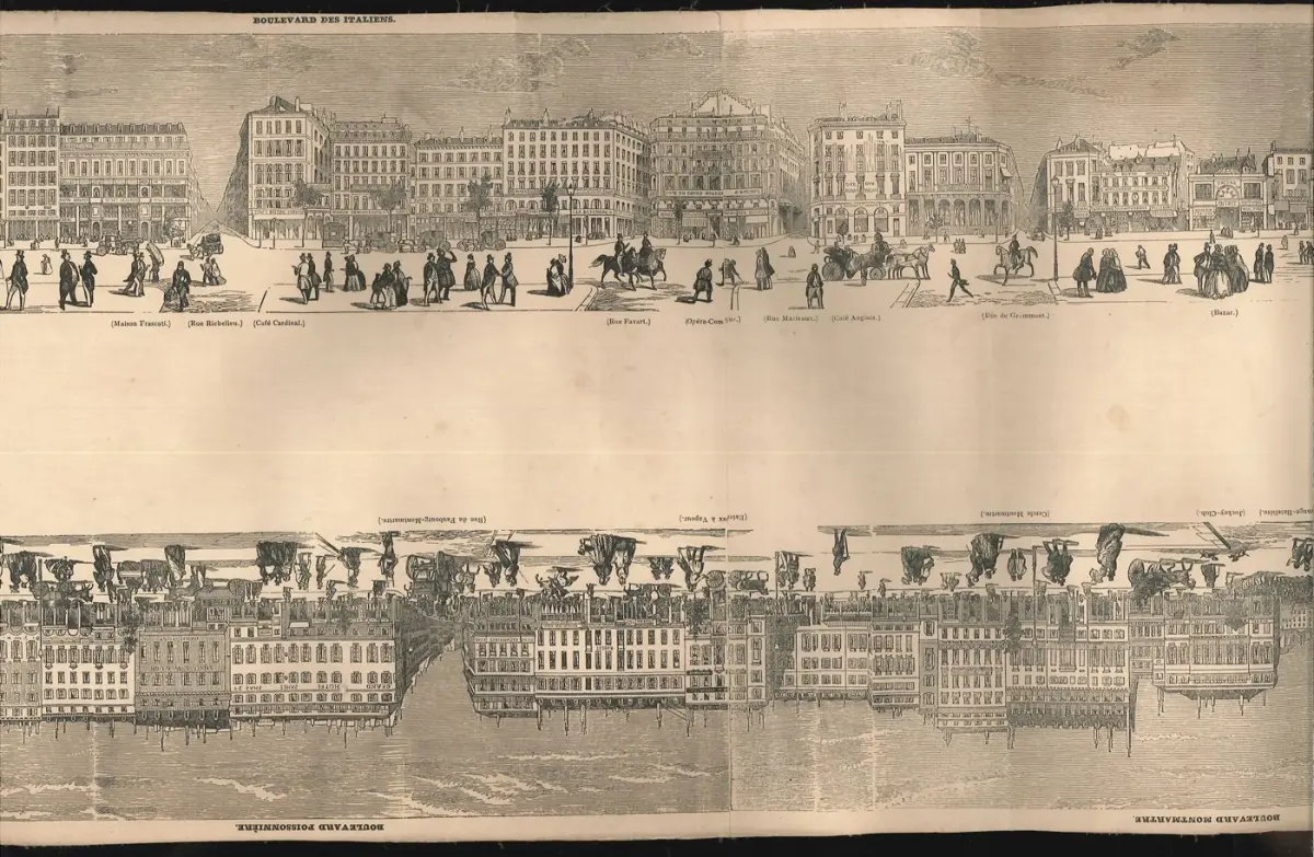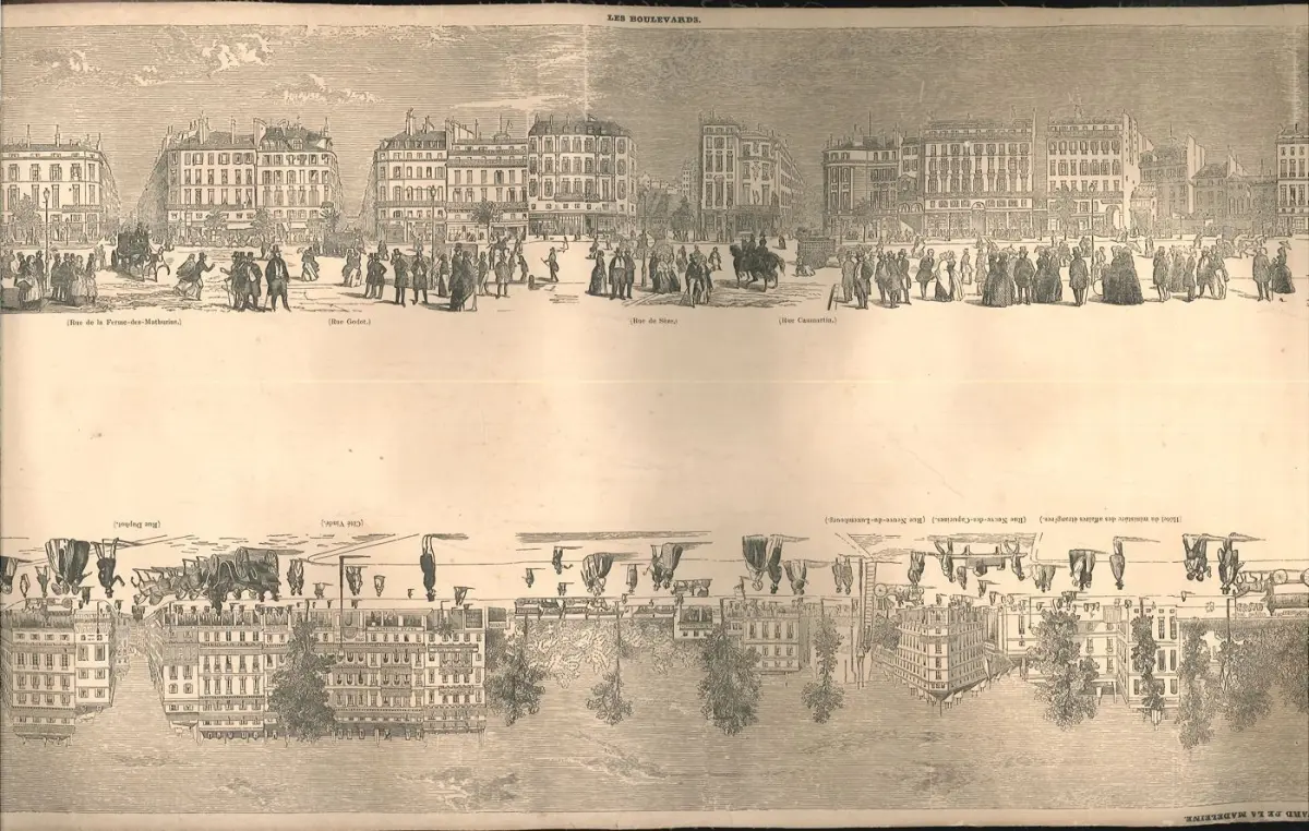 Bemerkungen: Seltenes, knapp 5 Meter langes Panorama der Pariser Boulevards, vom Place de la Madeleine bis zum Canal de l`Ourc, jeweils mit Ansichten beider Straßenseiten und Beschriftungen zu Cafés, Restaurants, Institutionen und Straßen. Zu Beginn mit einer Ansicht des Place de la Concorde und am Schluss des Place de la Bastille. Das eindrucksvolle Panorama schuf der Maler und Illustrator Édouard Renard (1802-1857). Es wurde von der 1843 gegründeten Zeitung "L`Illustration" publiziert. Auf der originalen Holzrolle aufgerollt.