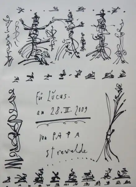 Edition Galerie auf Zeit. Gr.-2°. Pressendruck. Originalgrafisches Künstlerbuch mit sieben signierten Grafiken von Strawalde in einer Auflage von 40 Exemplaren. Vorliegendes Exemplar stammt aus dem Besitz von Lucas Böttcher (den Sohn Strawaldes). Der Einband ist vorne und hinten großflächig mit Filzstift bemalt und anschließend mit Wachs von Strawalde bearbeitet worden. Der Vorsatz ist ganzseitig mit ornamentartigen Zeichnungen bearbeitet und mit einer Widmung (Für Lucas am 28.3.2009) versehen.