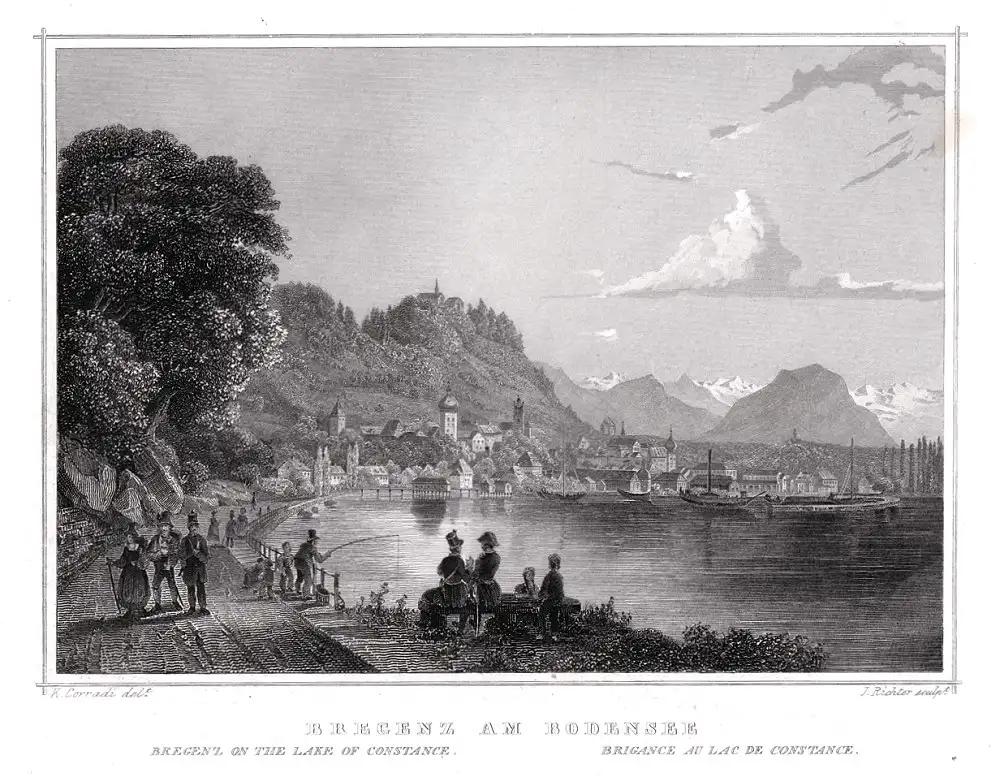 Bregenz am Bodensee aus. Echter Stahlstich, Richter um 1850