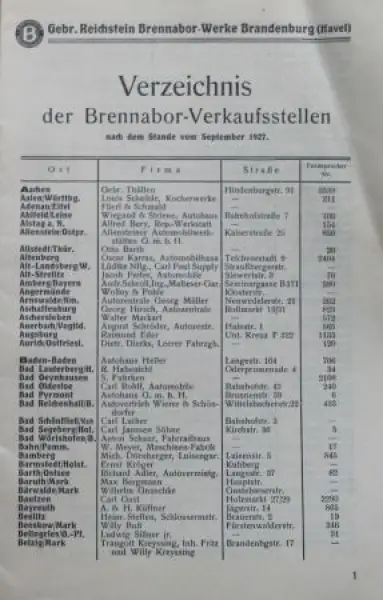 Brennabor Modellprogramm 1927 "Verzeichnis der Verkaufsstellen" Automobilprospekt (8065)