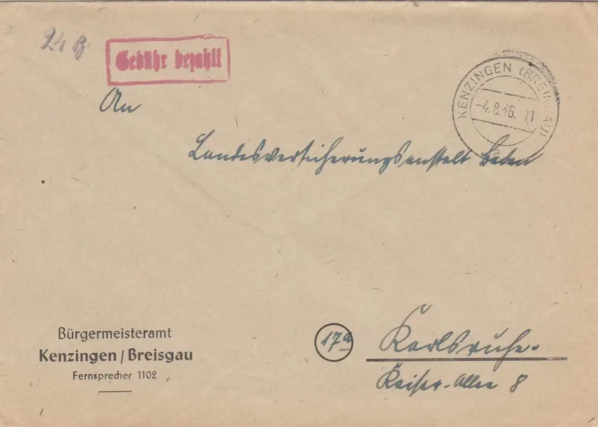 Brief 1946 von Kenzingen/Breisgau, Gebühr bezahlt, nach Karlsruhe