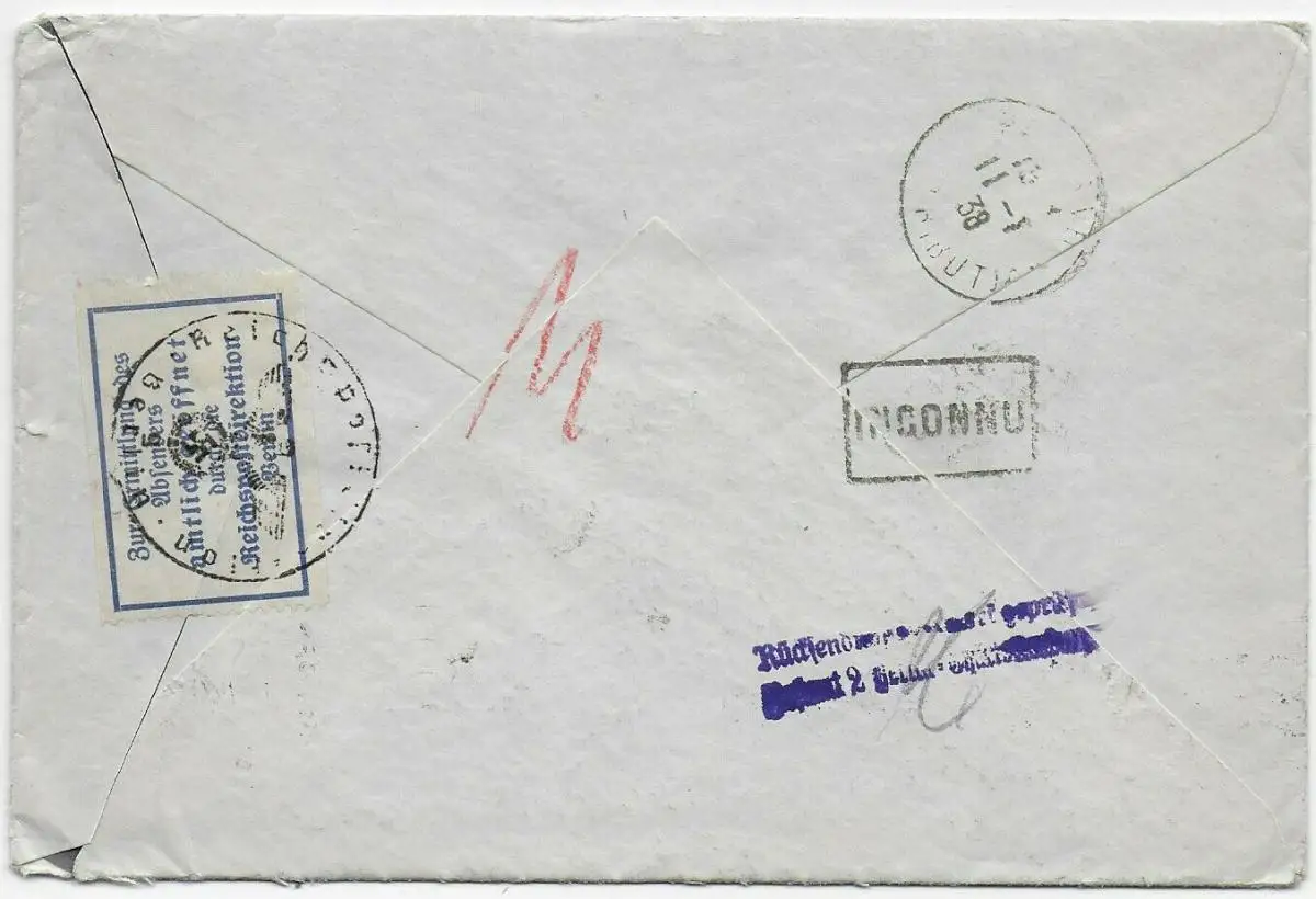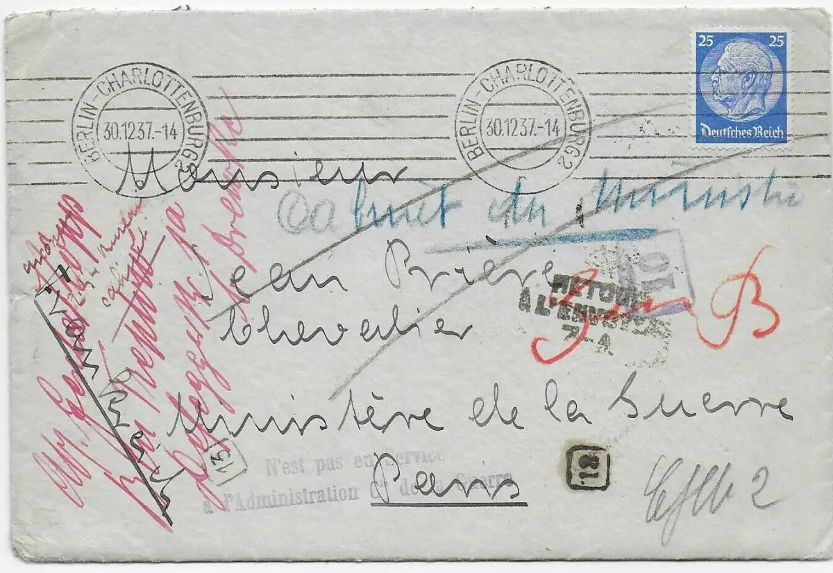 Brief von Berlin Charlottenburg 1937 nach Paris und zurück, zollamtlich geöffnet