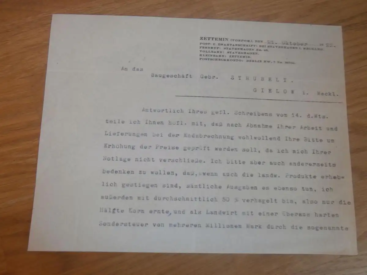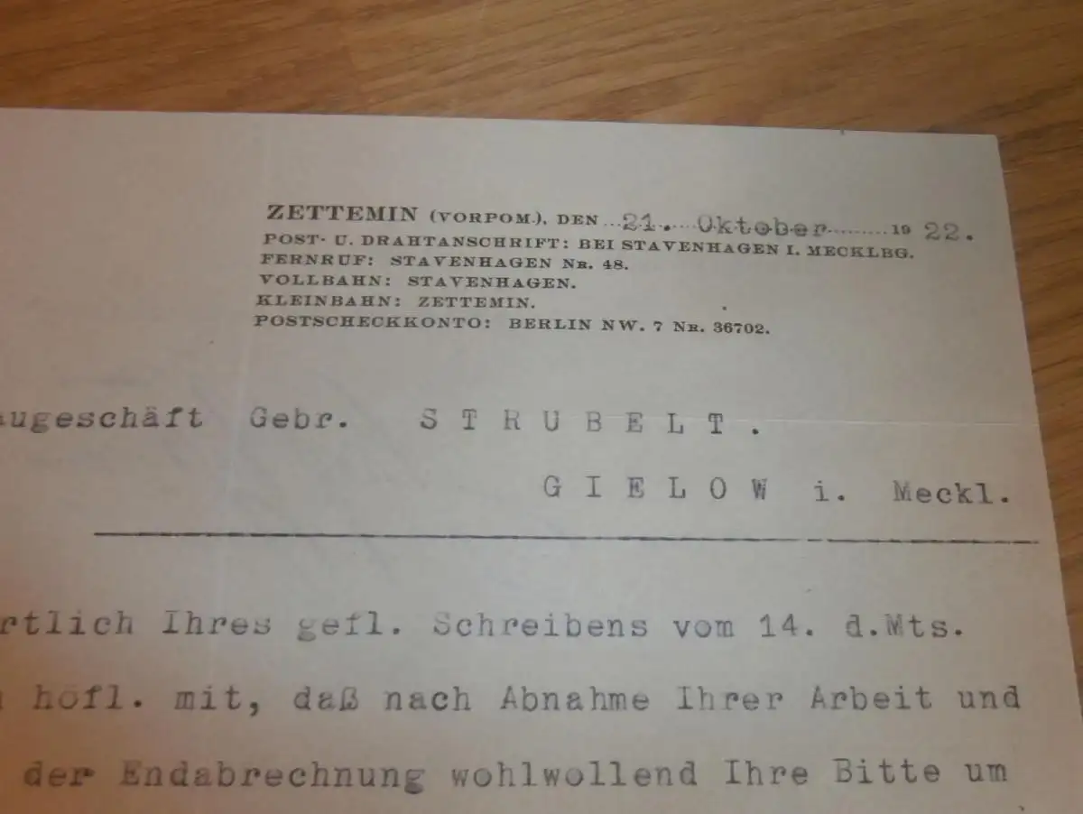 Brief von Graf von Schwerin in Zettemin i. Mecklenburg , 1922 , bei Neubrandenburg , mit Autograph !!