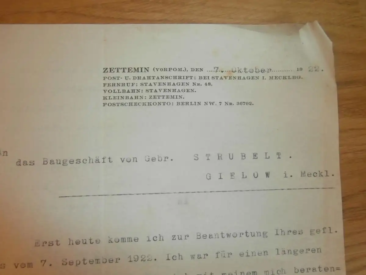 Brief von Graf von Schwerin in Zettemin i. Mecklenburg , 1922 , bei Neubrandenburg , mit Autograph !!