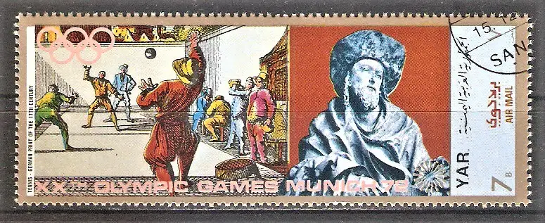 Briefmarke Jemen-Nord (Arab. Republik) Mi.Nr. 1377 o Olympiastadt München - Sport im Mittelalter - Skulpturen 1970 / Tennisspiel