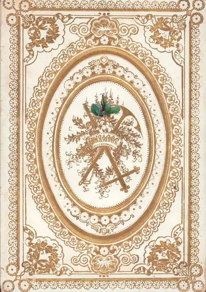 Seitenanzahl: 2 Briefbögen, blanco, Blattgröße ca. 21 x 13,5 cm. Vorderseite mit Zierleiste in Reliefprägung u. mont. farb. kl. Oblate in der linken oberen Ecke; sowie 1 kleines gefalt. Kuvert, ca. 6,5 x 10,5 cm, dito (Rand mit Blindprägung). Zusammen in weißem, papier