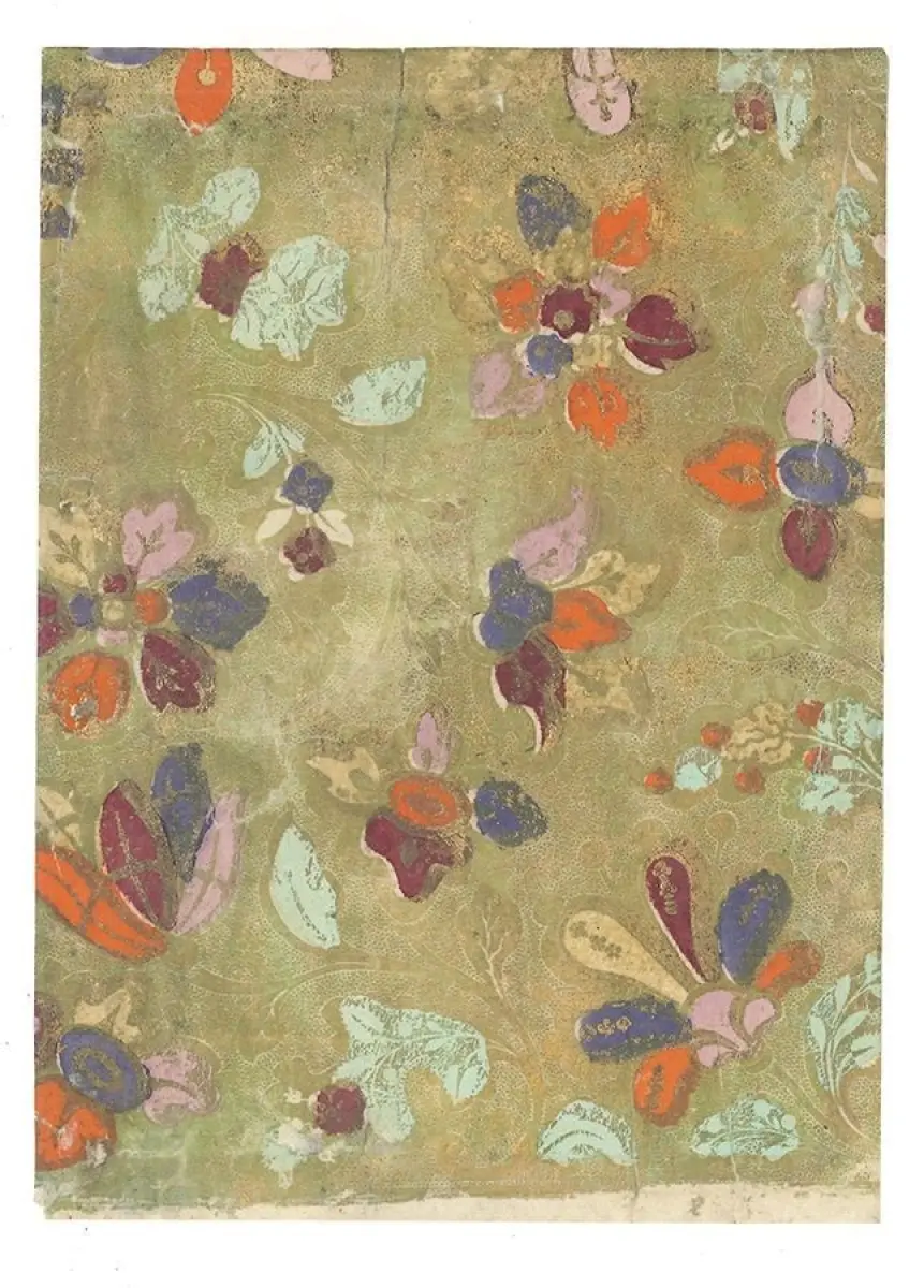 Bemerkungen: Krause/Rinck 2021, S. 82-97 - Ursprünglich als Einband verwendetes Brokatpapier mit goldfarbenem Positiv-Plattenschnitt auf einfarbig rot gestrichenem Papier. Am ehemaligen Broschurrücken gebrochen, in 2 Teilen vorliegend. Mit floralem und ornamentalem Dekor mit kleinen Blüten, Hunden, Hirschen, Vögeln und Kamelen. Brokatpapier wurde historisch häufig auch als "Augsburger-Papier" bezeichnet und hatte seine Hochblüte in der 1. Hälfte des 18. Jahrhunderts. Herstellungszentren waren vor allem Augsburg und Nürnberg.