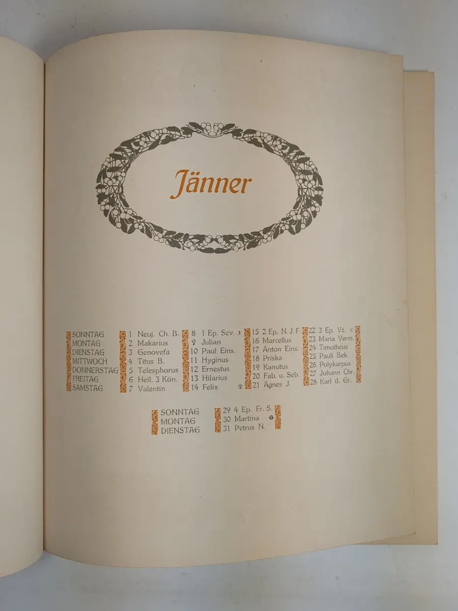 Bemerkungen: Zustand: der Schutzumschlag etwas fleckig, angestaubt und mit Randanrissen, die Broschur sauber und frisch, der Kalender ausgegeben von der Farbenfabrik Kast & Ehinger, die die Farben für den Druck der Illustrationen von Lefler und Urban lieferte, ein prächtiger Druck mit beeindruckenden farbigen Illustrationen der beiden Wiener Künstler