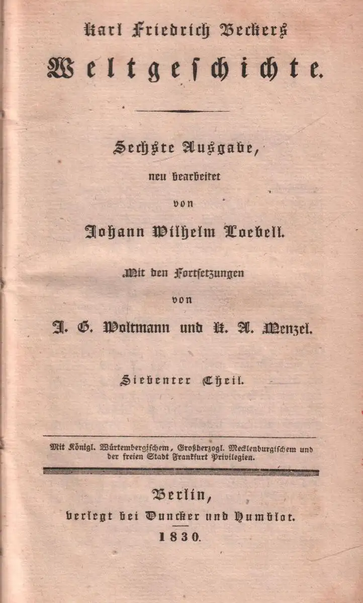 Bemerkungen: Zustand: Einband etwas berieben, Ecken bestoßen, Papier etwas gebräunt, Buchrücken fehlt // Text in Fraktur. Sechste Ausgabe, neu bearbeitet von Johann Wilhelm Loebell. Mit den Fortsetzungen von J. G. Woltmann und K. A. Menzel