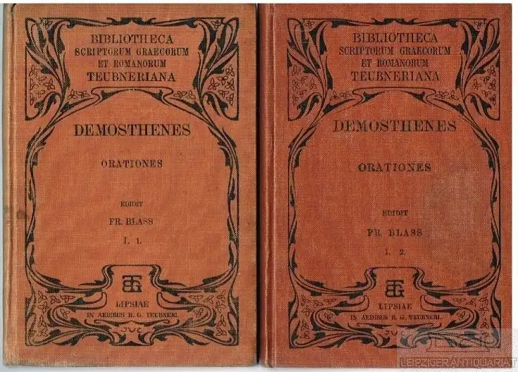 Bemerkungen: Zustand: Der erste Band farblich etwas heller , leicht fleckig und am Rücken lichtbedingt aufgehellt, die Schnitte leicht angestaubt, die Buchblöcke sauber, im Teil 1 mit Anstreichungen und Marginalien, im 2. Teil der Verlagsanhang mit lieferbaren Ausgaben auf holzhaltigem Papier gedruckt, Teil zwei ohne Titelblatt // Bibliotheca Scriptorum Graecorum et Romanorum Teubneriana. - vollständiger Titel: Demostheneis Orationes - I. 1 und I. 2: Vol. I, Pars I, Orationes I - XVII. Editio stereotypa. ; Vol. I Pars II, Orationes XVIII - XIX