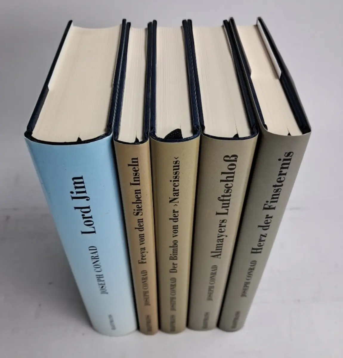 Bemerkungen: Zustand: Schuber minimal berieben, insgesamt sauber und frisch // Die Ausgabe beinhaltet die Bände: Lord Jim; Freya von den sieben Inseln; Der Bimbo von der "Narcissus"; Almayers Luftschloß; Herz der Finsternis. Neu übersetzt von Nikolaus Jansen, Glaus Hoffer, Wolfgang Krege und Urs Widmer.