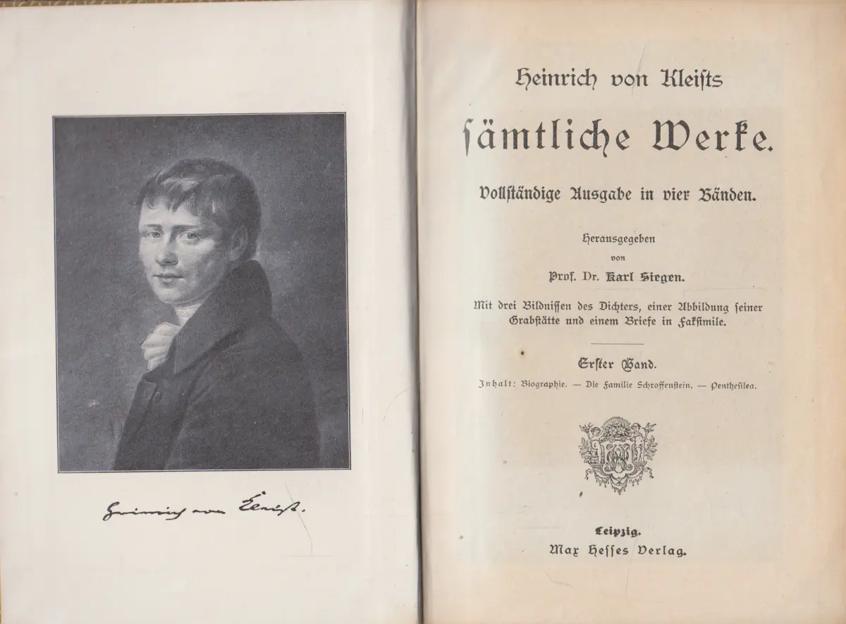 Bemerkungen: Zustand: Einband etwas berieben, Papier gebräunt // Inhalt: Bd.1: - Biographie- Die Familie Schroffenstein - Penthesilea, Bd.2: -Amphitryon - Der zerbrochene Krug (mit Nachtrag) - Das Käthchen von Heilbronn, Bd.3: Erzählungen, Fabeln, Anekdoten, Vermischtes, Bd.4: -Prinz Friedrich von Homburg- Die Hermannsschlacht - Robert Guiskard, Herzog der Normänner (Fragment)- Gedichte, Epigramme etc., Außentitel: Kleists Werke. Herausgegeben von Prof. Dr. Karl Siegen. Mit drei Bildnissen des Dichters, einer Abbildung seiner Grabstätte und einem Briefe in Faksimile. Druck in Fraktur