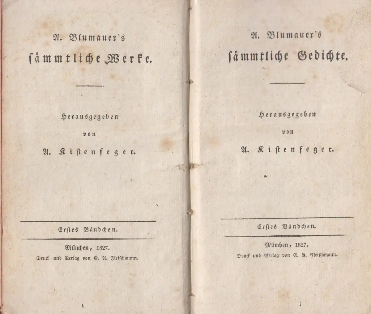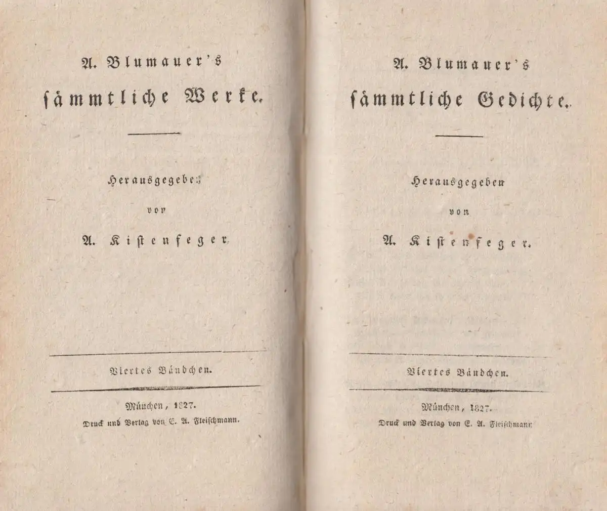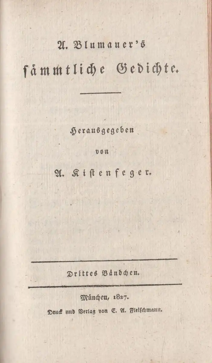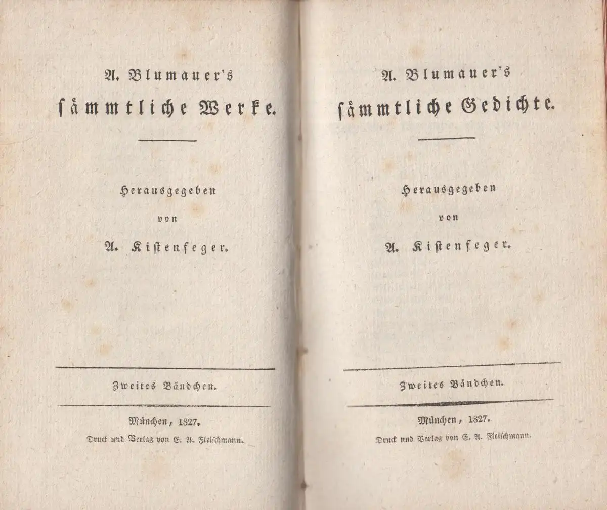 Bemerkungen: Zustand: Einband etwas berieben, Ecken bestoßen, Rücken nur noch fragmentarisch vorhanden // Herausgegeben von A. Kistenfeger. Sämmtliche Werke Band 1-4. Text in Fraktur.