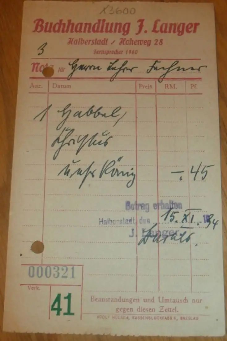 Buchhandlung - J- Langer in Halberstadt , 1934 , alte Rechnung , Reklame / Werbung !!AZ-WR/1M