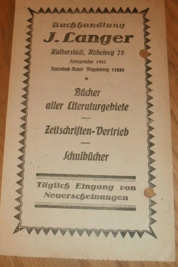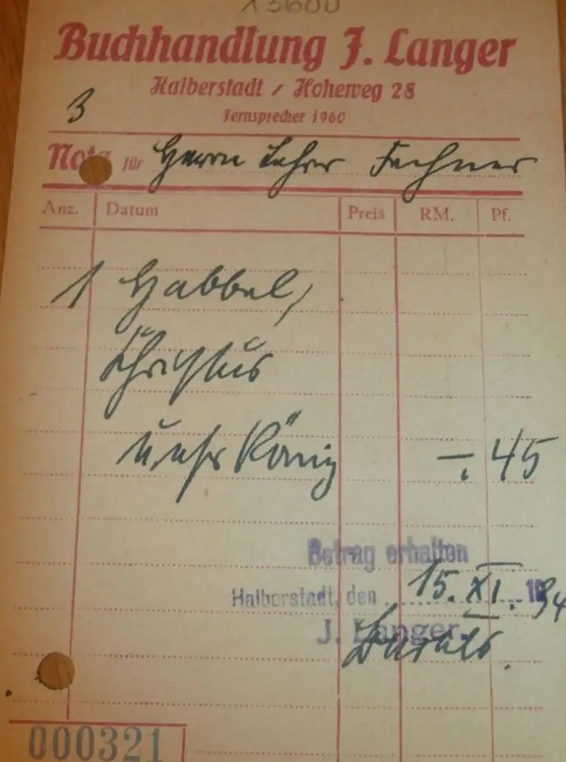 Buchhandlung - J- Langer in Halberstadt , 1934 , alte Rechnung , Reklame / Werbung !!