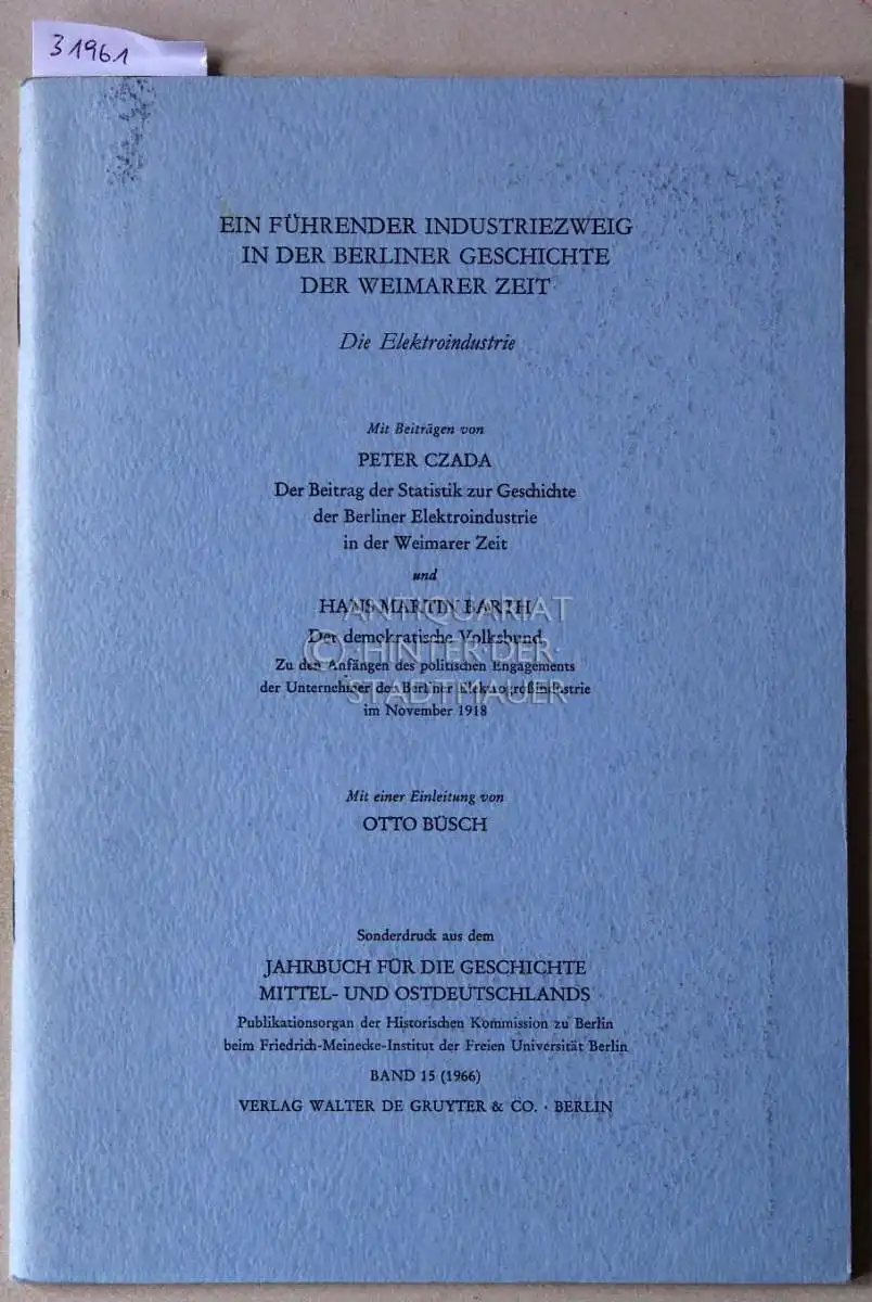 Titel: Ein führender Industriezweig in der Berliner Geschichte der Weimarer Zeit: Die Elektroindustrie. (Peter Czada: Der Beitrag der Statistik zur Geschichte der Berliner Elektroindustrie in der Weimarer Zeit; Hans Martin Barth: Der demokratische Volksbund) [= Sonderdruck aus dem Jahrbuch für die Geschichte Mittel- und Ostdeutschlands, Band 15/1966]