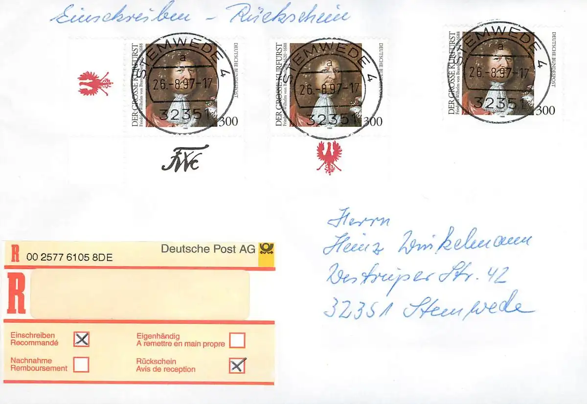 Bund: Einschreiben Stemwede mit MiNr. 1781, Mehrfachfrankatur