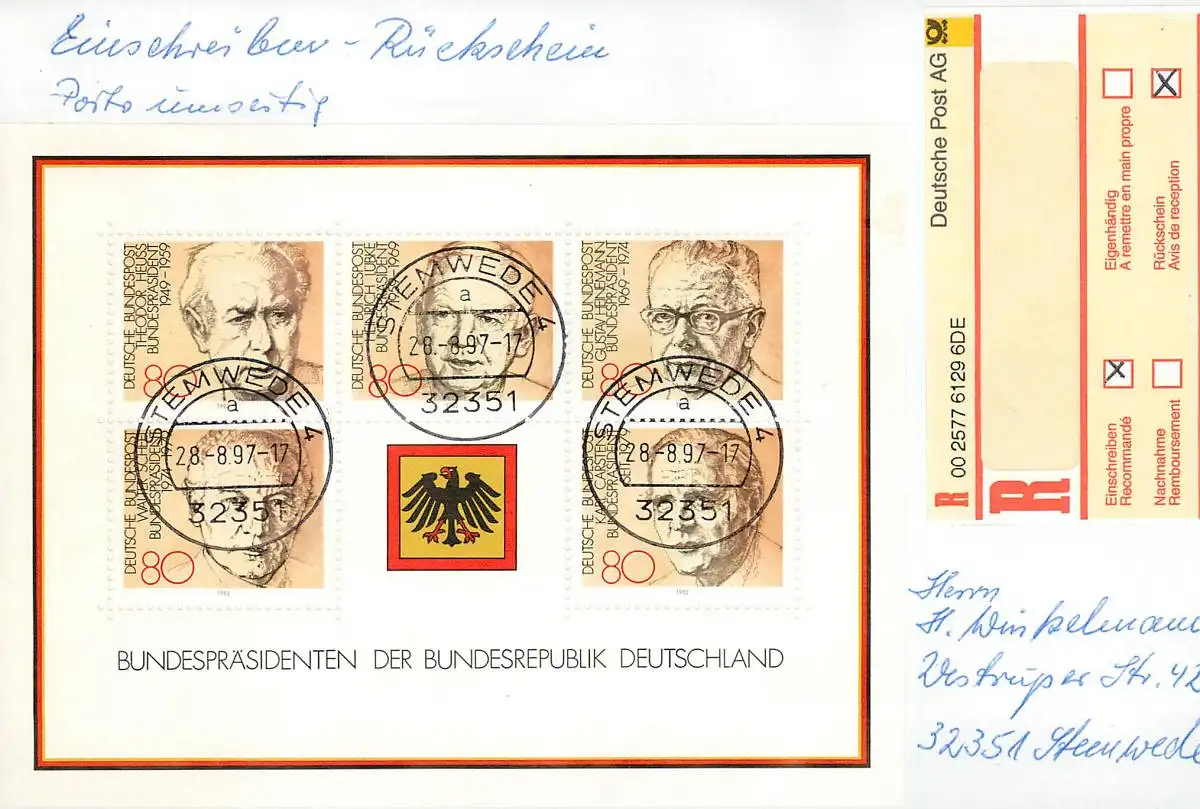 Bund: Einschreiben Stemwede mit MiNr. Block 18, Mehrfachfrankatur