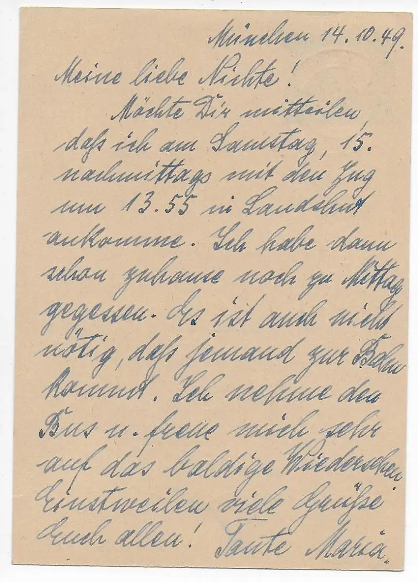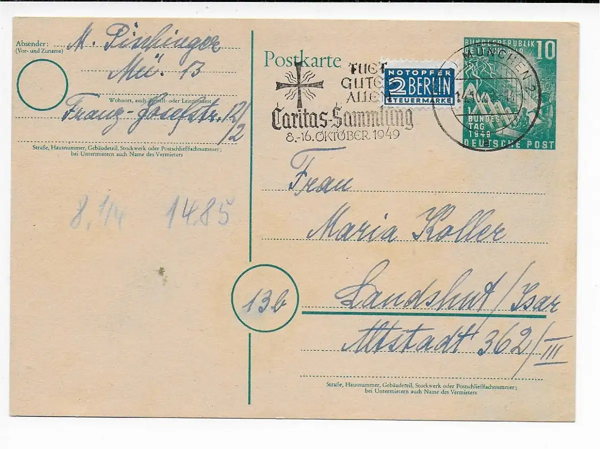 Bund: Ganzsache München 1949 nach Landshut