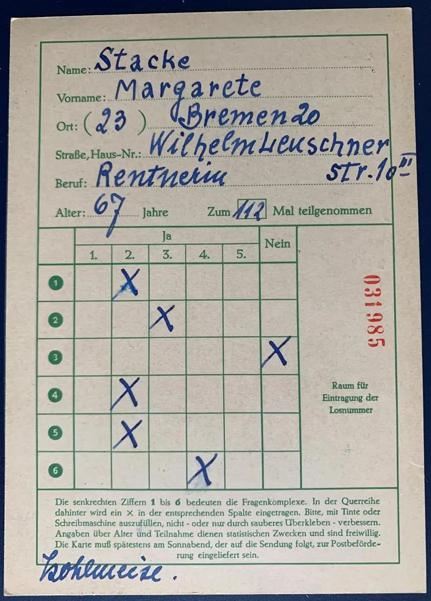 Funklotterie Postkarte, gelaufen mit Poststempel vom 12.05.1960 von Bremen nach Hamburg, Karte ist sehr gut erhalten.
