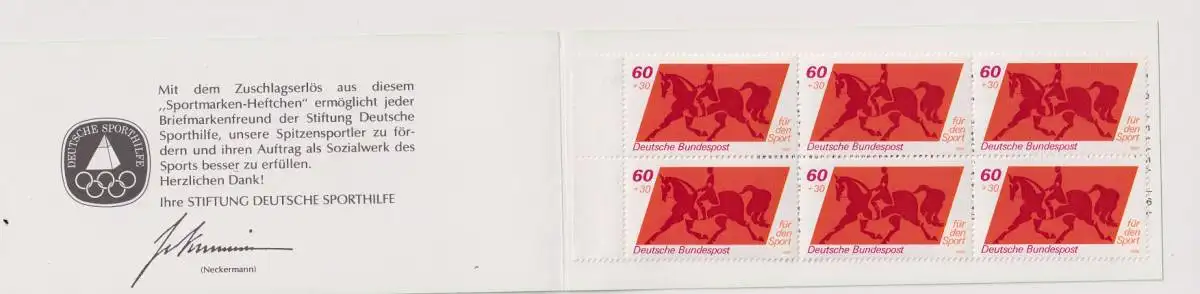 Bund Sport Markenheftchen mit 6x 1047 ** dabei 1x Plattenfehler I : kurzes p in Bundespost (Feld 5 )
