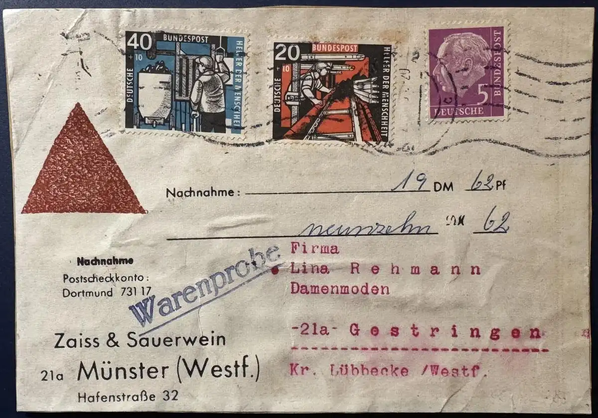 Nachnahme, Bund, 1957, Vorderseite einer Warenprobe per Nachnahme, Mischfrankatur bestehend aus Mi.Nr. 179, 272 und 273, gelaufen von Münster nach Gestringen (Datum des Poststempels nicht lesbar).