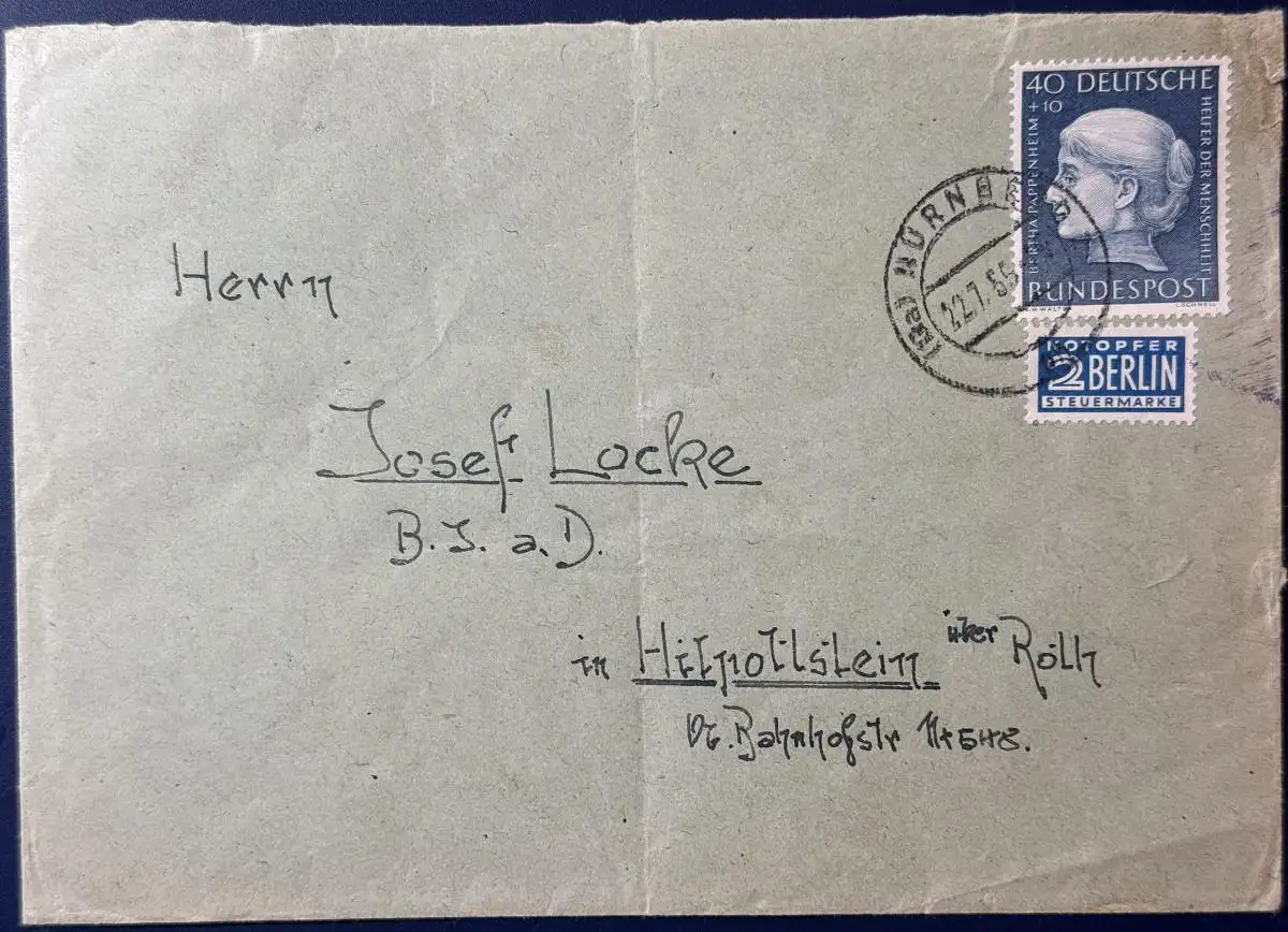 Bedarfsbrief, Bund, frankiert mit Mi.Nr. 203 und Notopfer, gelaufen mit Poststempel vom 22.07.1955 von Nürnberg nach Hilpoltstein. Brief hat Mittelknick, ansonsten gut erhalten.