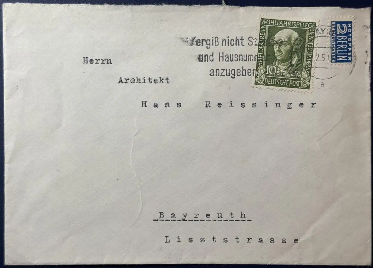 Bedarfsbrief, Bund, frankiert mit Mi.Nr. 118 und Notopfer, gelaufen mit Poststempel vom 19.02.1950 in Bayreuth.